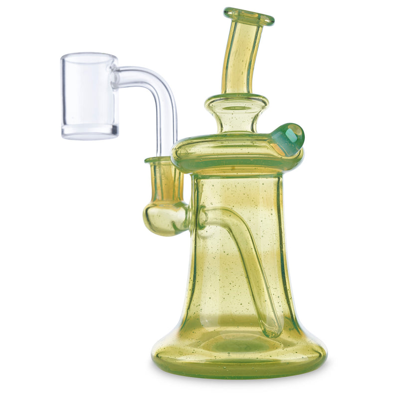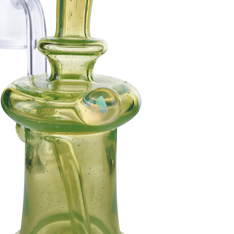 Kenta Kito Glass is popular for producing high-quality and affordable glass rigs. This Banger Hanger by Kenta Kito is a small slyme green dab rig with a beautiful opal encasement in the back. This rig features a 10mm female joint at a 90 degree angle. Enjoy your concentrates with the fantastic Kentak Banger Hanger today!