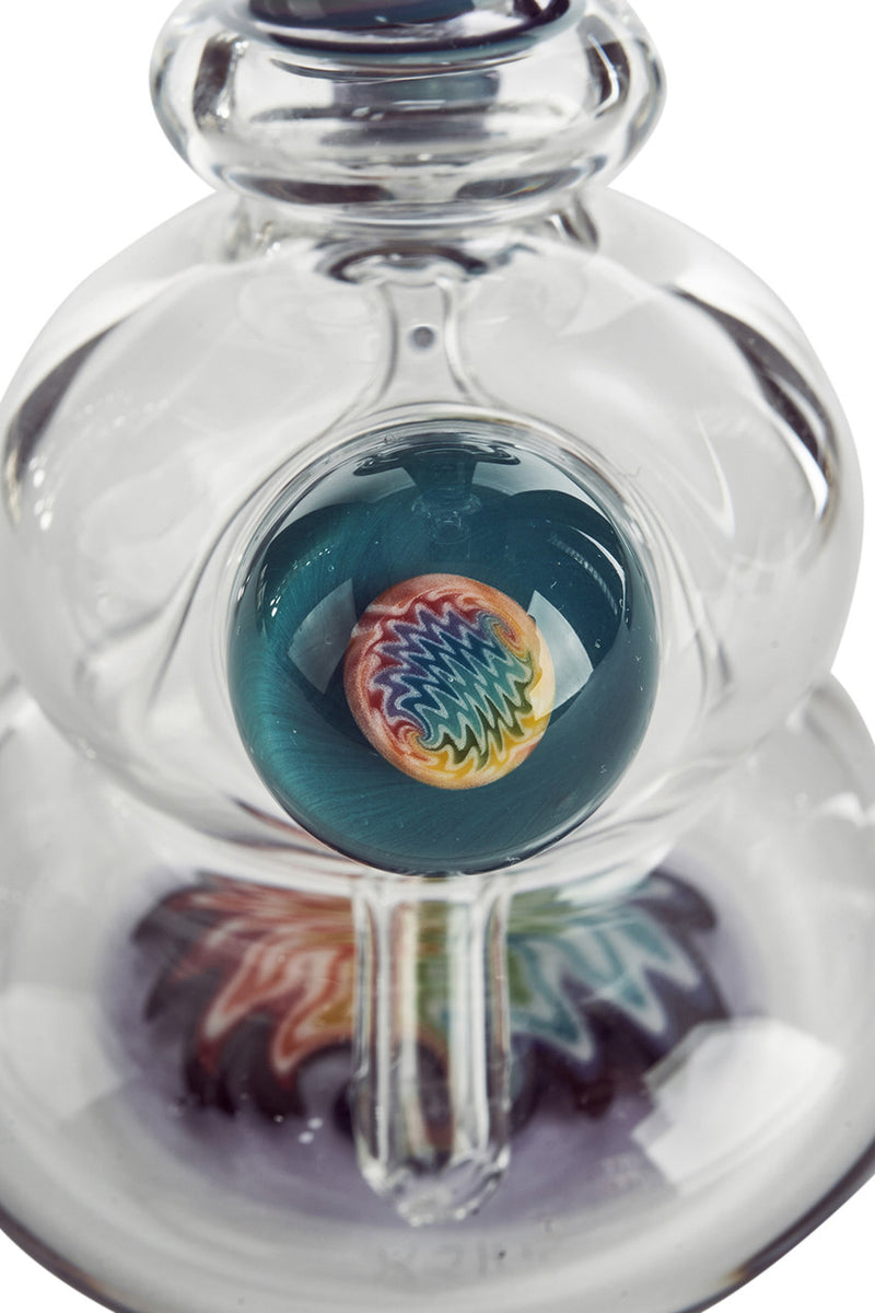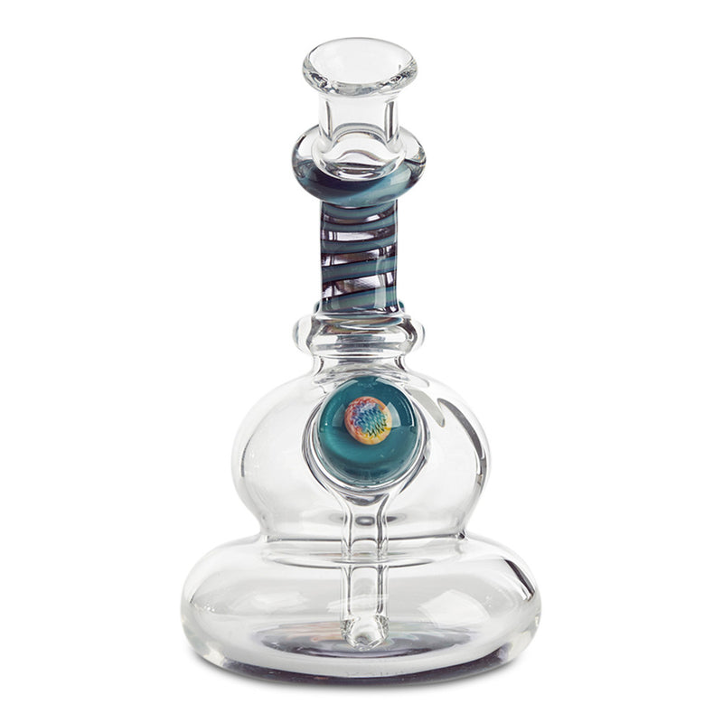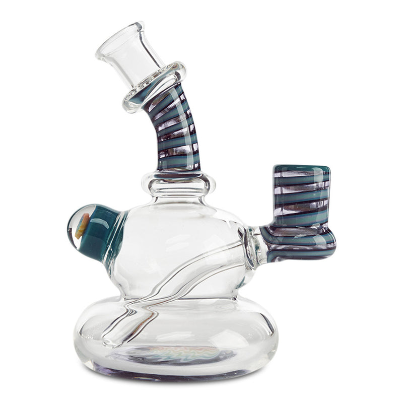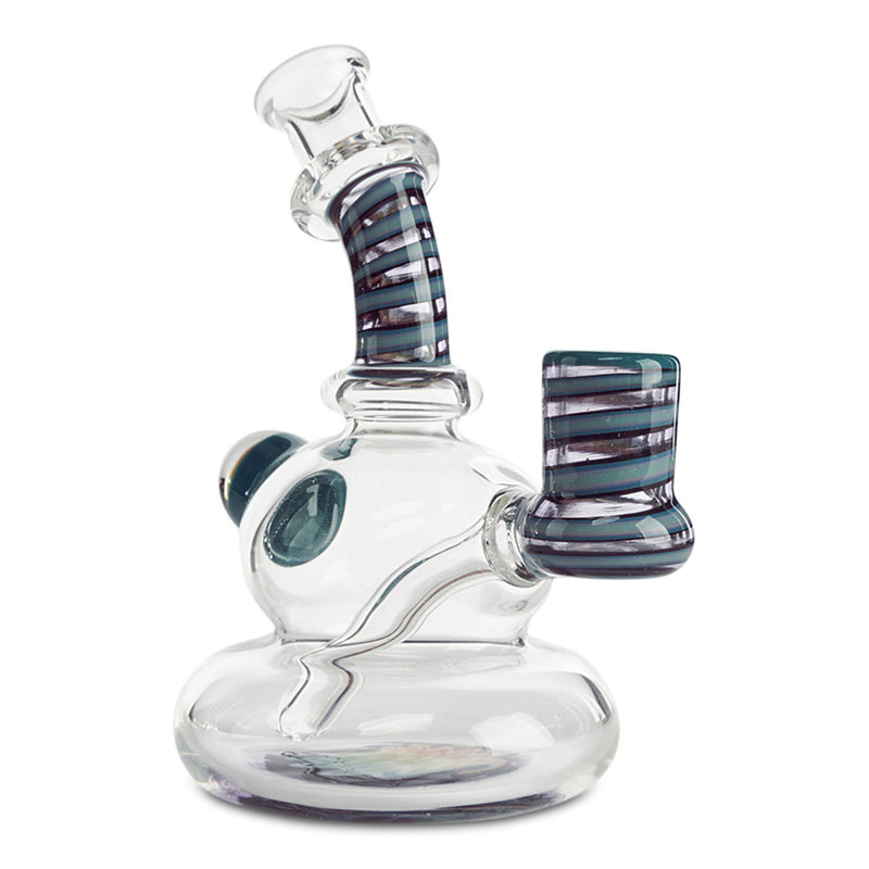 Kevin Howell's banger hangers are out of sight! This little guy has been completely decked out. With a worked wig wag in the base, worked joint, and worked neck, it has tons of blue color accents. To top it off, there is a murrina encasement on the backside of the rig.