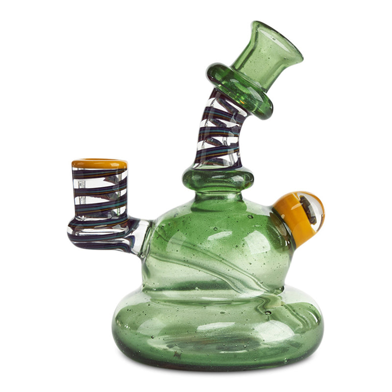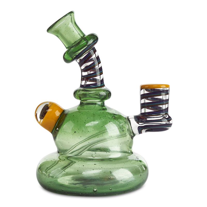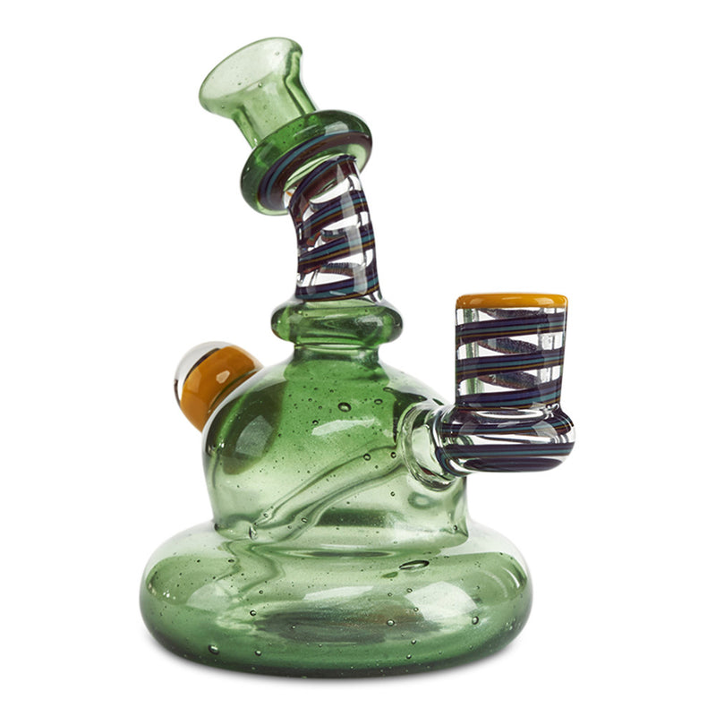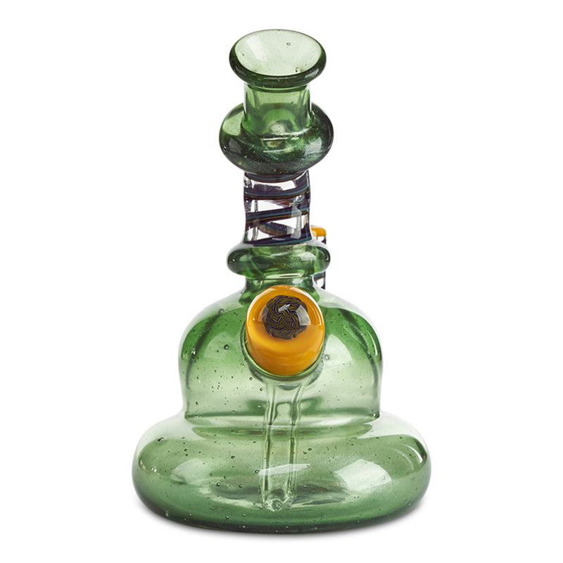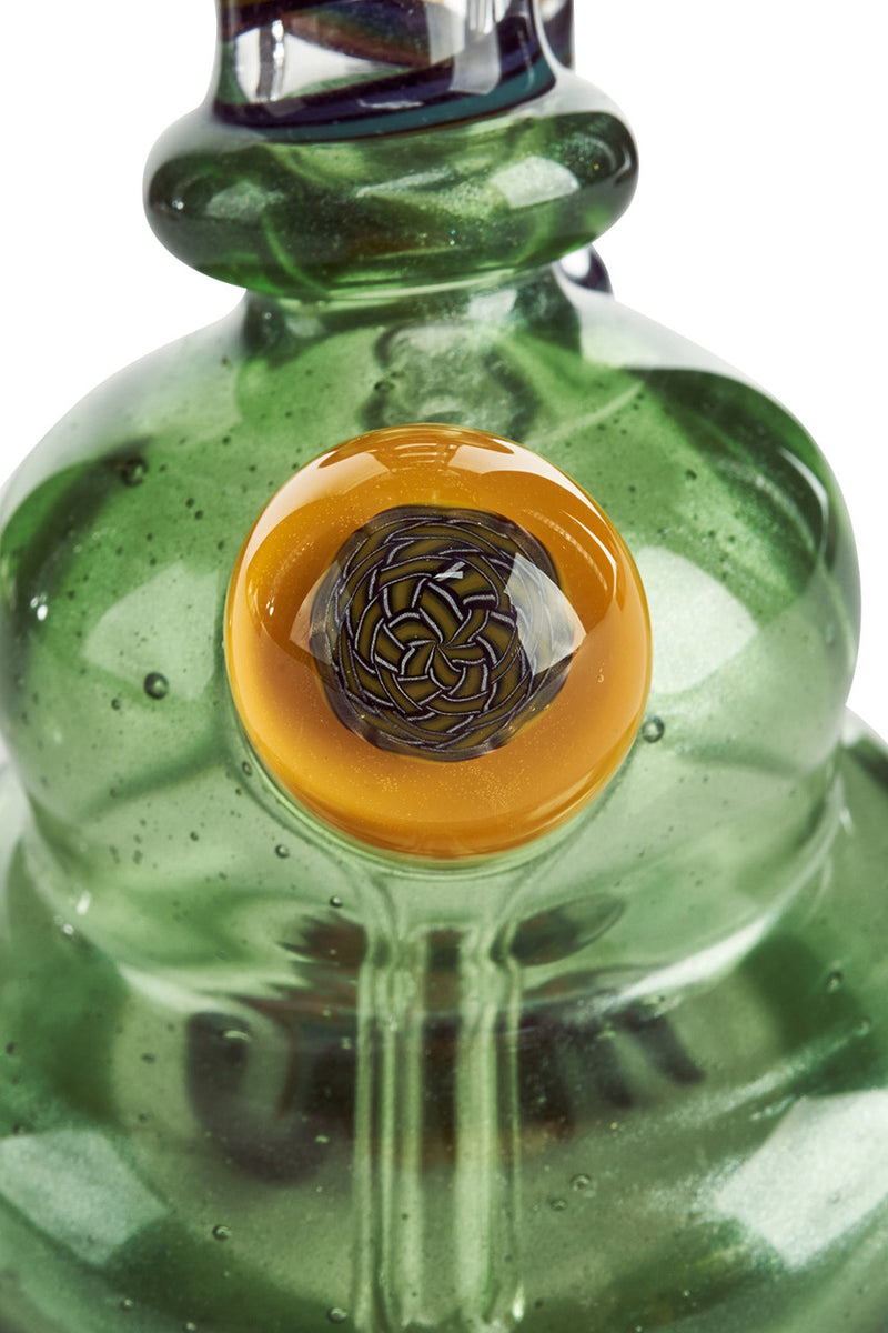 Kevin Howell is a glass artist in California. He is well known for his bi-polar wig wag, coil pot, and millie covered pieces. This beautiful banger hanger is a moss colored rig featuring a worked joint, worked neck, and wig wag in the base. Additionally, there is a murrina encasement on the backside of the piece. This piece has yellow linework on the top of the joint and around the encasement. The banger hanger has a 10mm female joint.