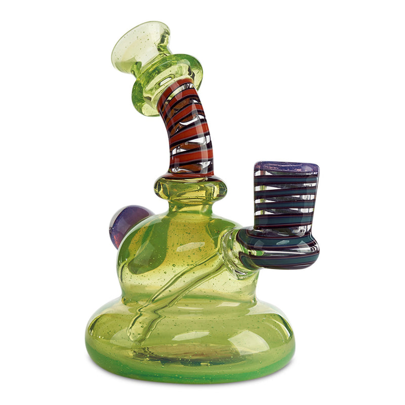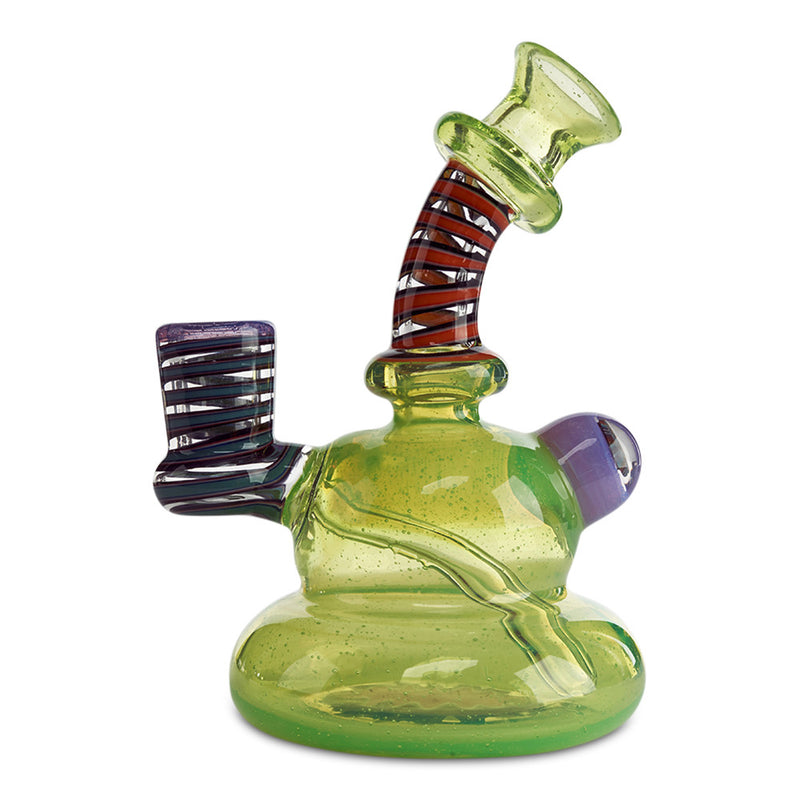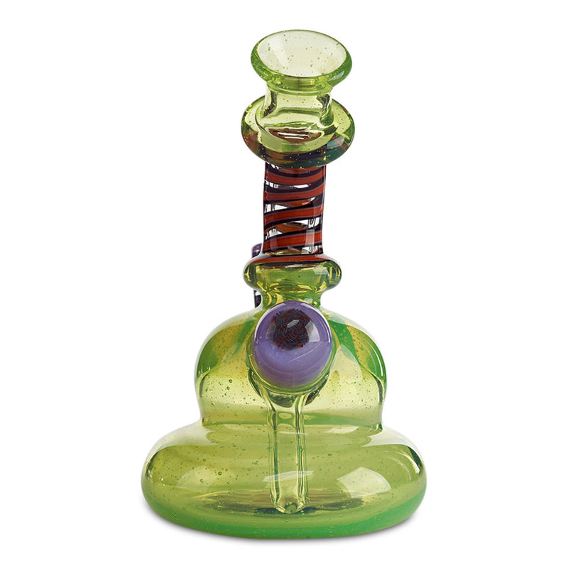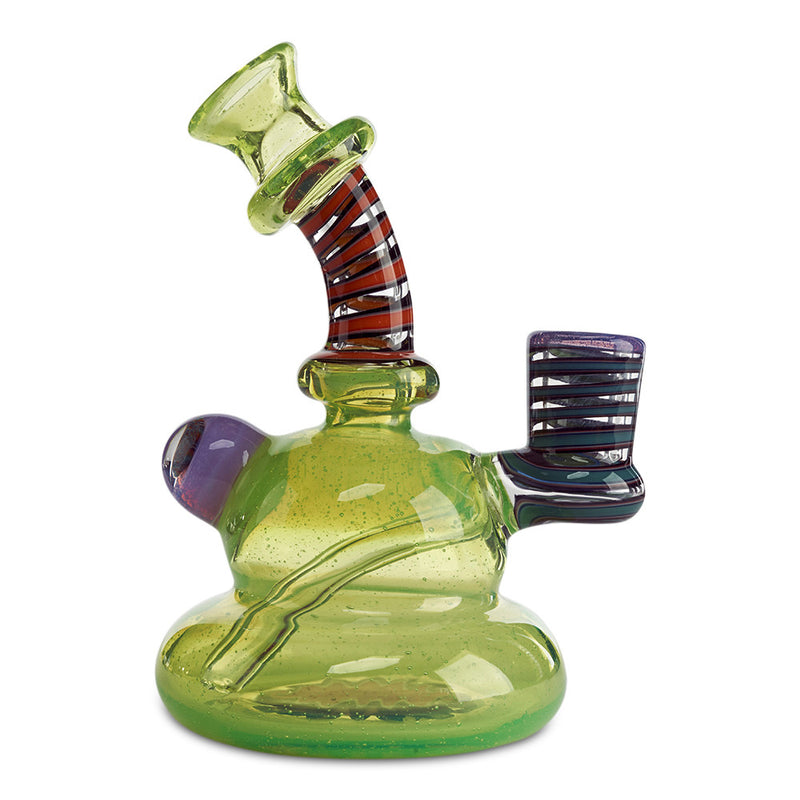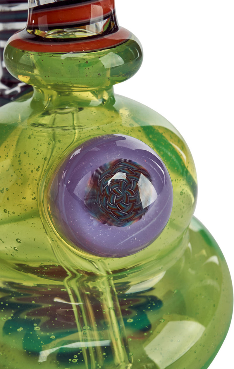 Make your collection pop with the fully worked banger hanger by Kevin Howell. California Glass Artist, Kevin Howell, is master of his craft using beautiful color combinations with his impressively clean line work in his glass pieces. This banger hanger is a beast of a rig with the slyme green body featuring a wig wag design in the base and UV linework throughout the neck and joint. If that isn't enough, the backside of the rig features a beautiful murrina encasement. Additionally, this fully worked banger hanger has a 10mm female joint.