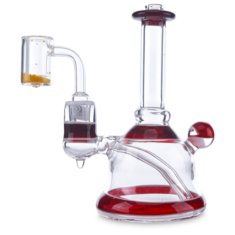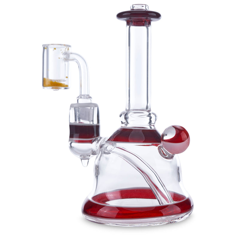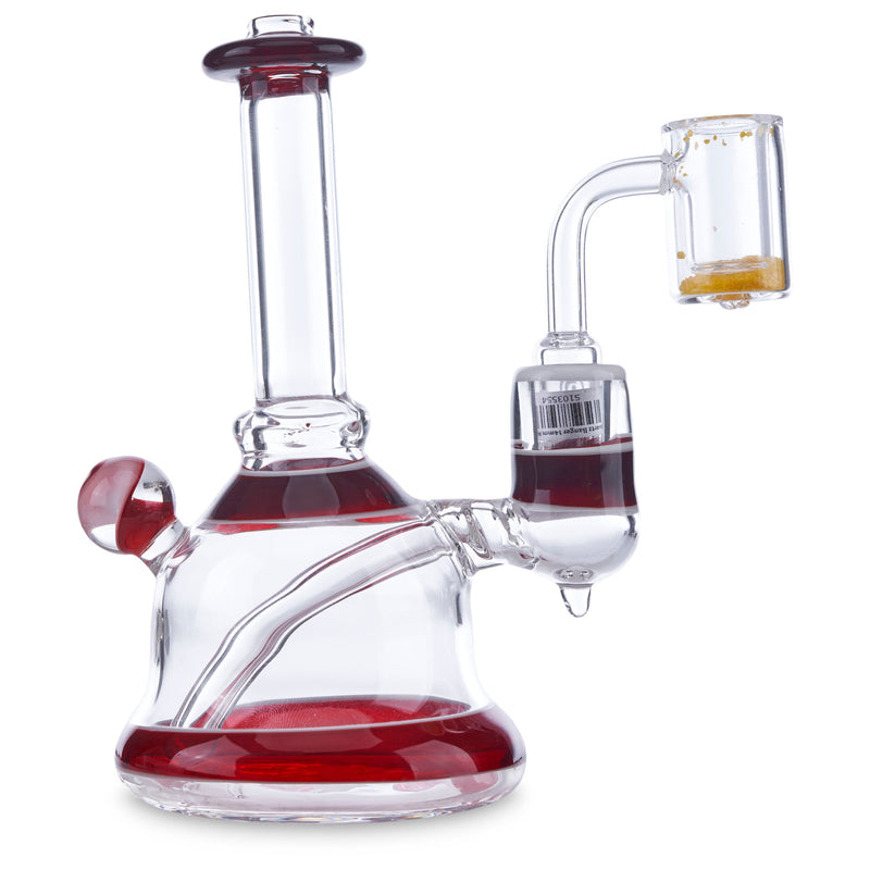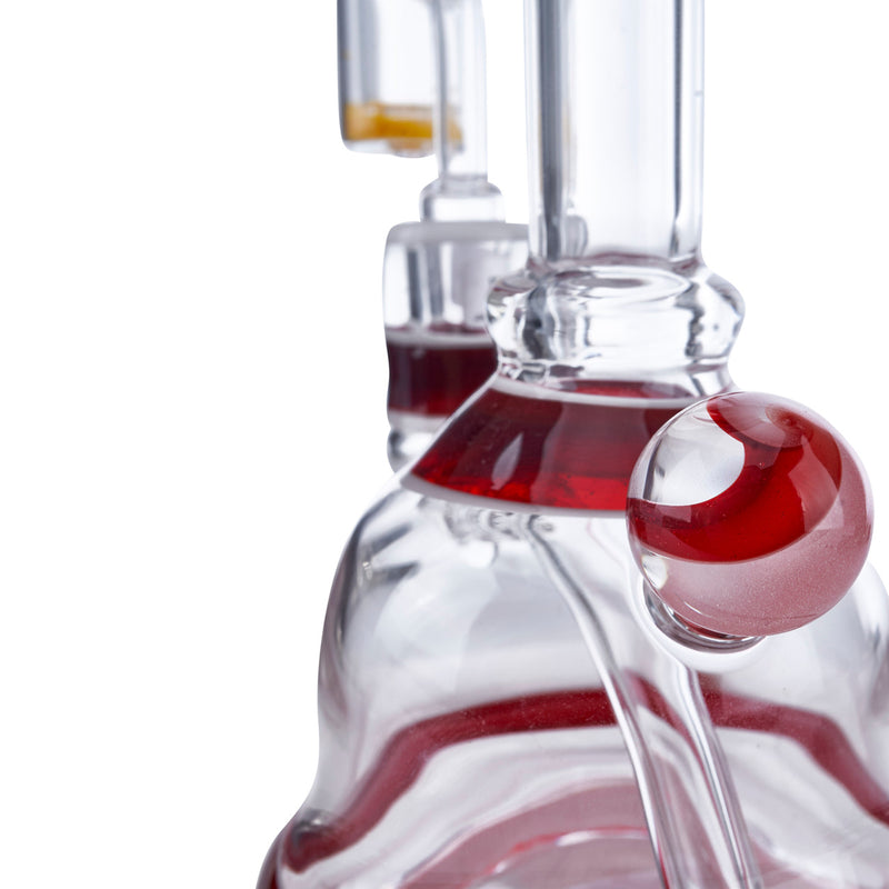 LionFist is a local Georgia glass artist who has been creating beautiful glass art for almost 20 years. He has worked and collaborated with many other popular artists such as Hans Frabel and Steve Sizelove. He has created many gorgeous water pipes, dab rigs, dab tools, and more that all feature signature colors. This beautiful banger hanger by LionFist has a red elvis design on the lip rim, top of the base, base rim, and around the joint. It also features a red elvis marble on the back of the pipe. This banger hanger is made with a 14mm female joint and a slitted down stem.