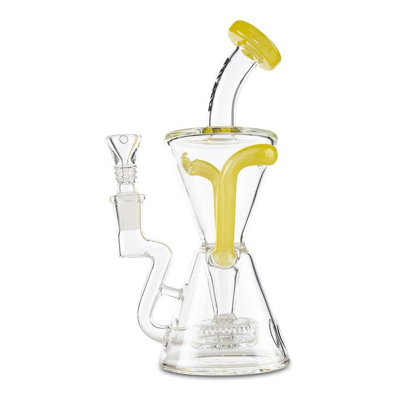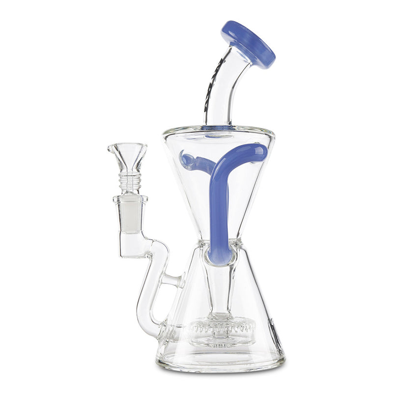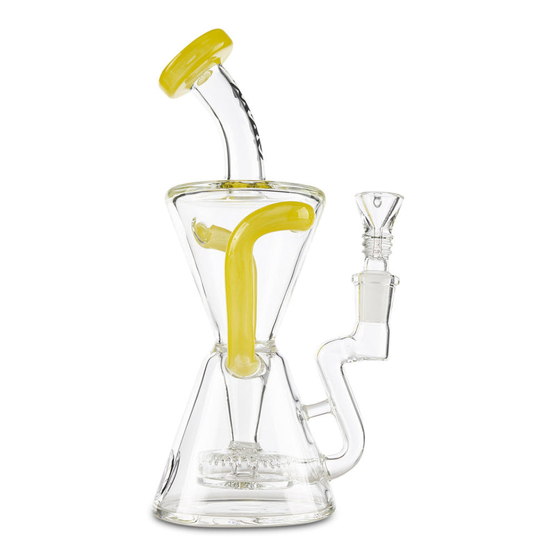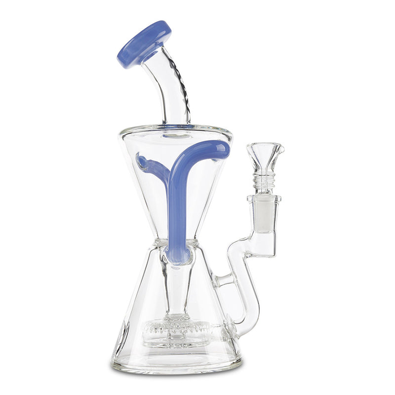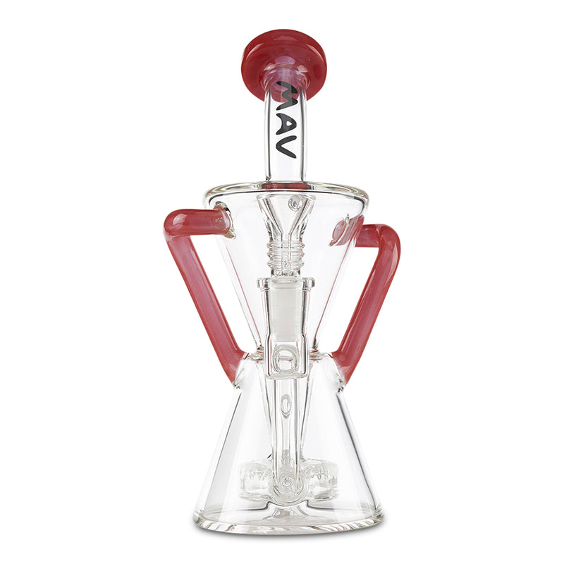 Achieve maximum filtration in a Dab Rig with the MAV Glass Slitted Puck Recycler. Made by Maverick Glass, this high-end dab rig provides you with maximum filtration and cooling with the recycler style construction. As you inhale, the smoke and water travel together through tubes that connect the chamber continuously recycling the water and smoke through the piece providing you with a cleaner and smoother hit. The recycler is reinforced with a technique called a "dewar's joint", which is a bridge between the two joints, this increase the strength of the joint and helps prevents breaking. Additionally, the MAV Slitted Puck Recycler features a vortex shaped drain to keep the water draining back to the bottom without any splash-back as well as a slit-puck percolator that adds more filtration to your smoke. Available in multiple color options.