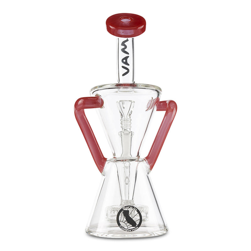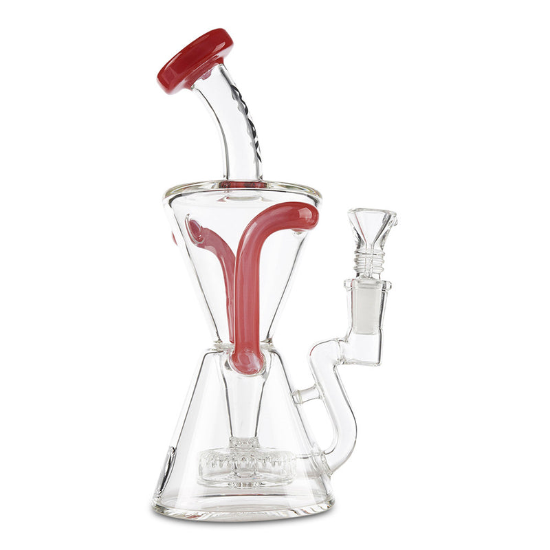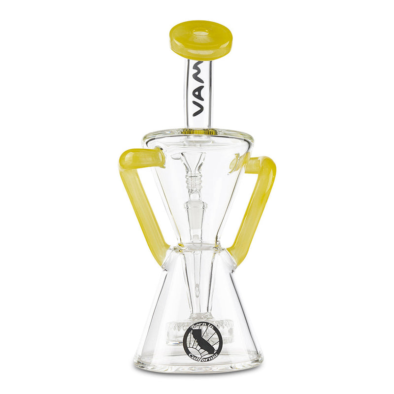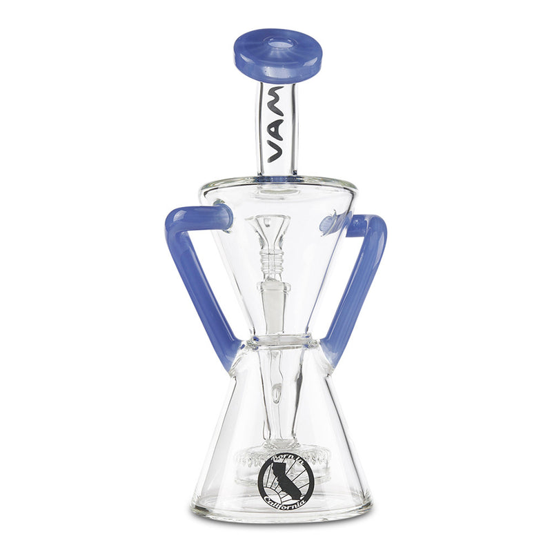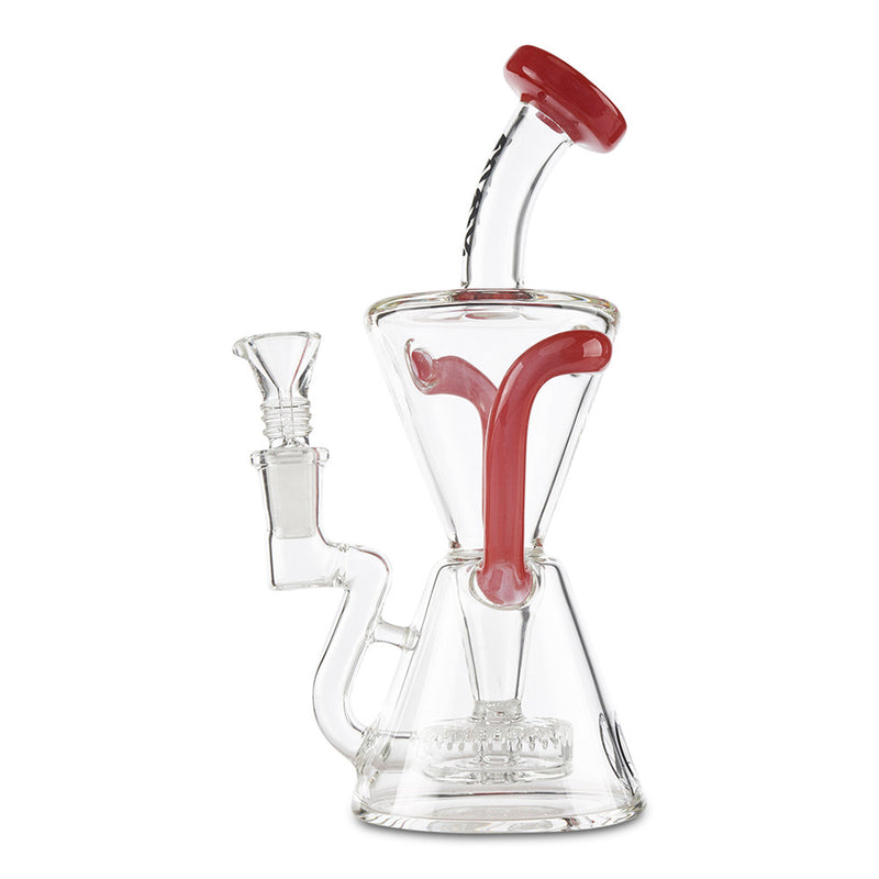 Achieve maximum filtration in a Dab Rig with the MAV Glass Slitted Puck Recycler. Made by Maverick Glass, this high-end dab rig provides you with maximum filtration and cooling with the recycler style construction. As you inhale, the smoke and water travel together through tubes that connect the chamber continuously recycling the water and smoke through the piece providing you with a cleaner and smoother hit. The recycler is reinforced with a technique called a "dewar's joint", which is a bridge between the two joints, this increase the strength of the joint and helps prevents breaking. Additionally, the MAV Slitted Puck Recycler features a vortex shaped drain to keep the water draining back to the bottom without any splash-back as well as a slit-puck percolator that adds more filtration to your smoke. Available in multiple color options.