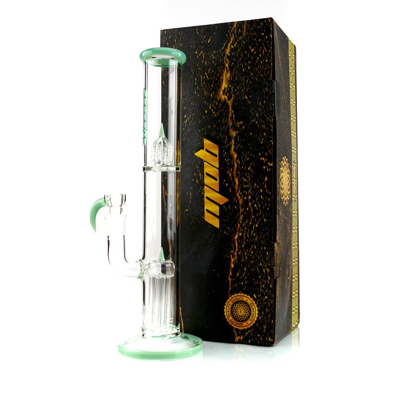The Mob 8 Tree to Splash Water Pipe by Mob Glass Works is a dab rig that features a diffuser to 8 tree percolators that goes into a splash set up and vibrant colors. This is a classic commentary on the tree perc style of dab rigs that evolve into multiple diffuser set ups, though they can still be used for flower. The Mac 8 Tree Dab Rig is an excellent piece that allows a user to pay the price for high end glass, but have the experience of a heady water pipe itself. This water pipe is a solid experience for amateur smokers and professionals alike.