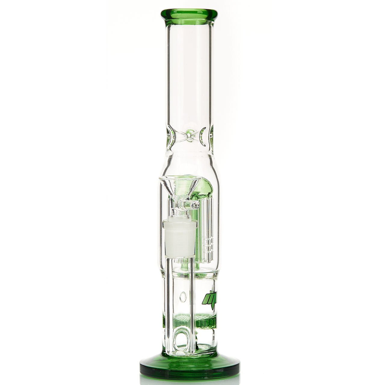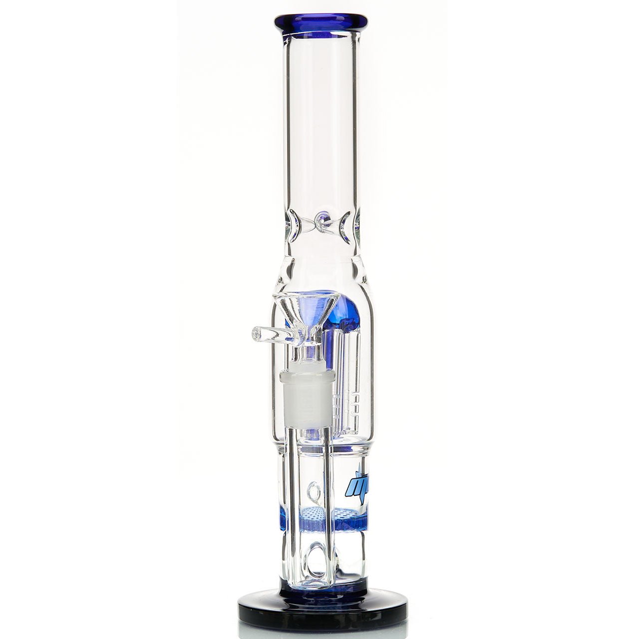 Invest in your next sesh and enjoy pips that taste sweet as honey--with the MOB Glass Beehive Water Pipe. Whether you are a beginner or an avid smoke enthusiast, this 10-inch tall borosilicate glass straight tube water pipe provides several features that make smoking your favorite flower, herb, oils, and waxes and concentrates a one-of-a-kind experience. First, let's start with the honeycomb perc at the base of your pipe. When inhaling, the smoke travels down the stem and through the honeycomb's tiny holes, which rapidly cools the smoke. The smoke then moves upward and is given extra filtration with the help of the 7-arm, triple-slitted tree perc. Once your filtered smoke hits the neck, it's cooled off with the help of the 3-pinch ice catcher. The MOB Glass Behive Water Pipe also has a flared mouthpiece for an increased, airtight seal. Complimenting the slender design on this piece is the flared base, which helps keep your water pipe steady on virtually any surface. The 14mm female joint features a reinforced Dewar's joint for added durability. The MOB Glass Beehive comes in a variety of attractive color options. You will also receive a matching 14mm male bowl/slide with handle along with this glass water pipe.