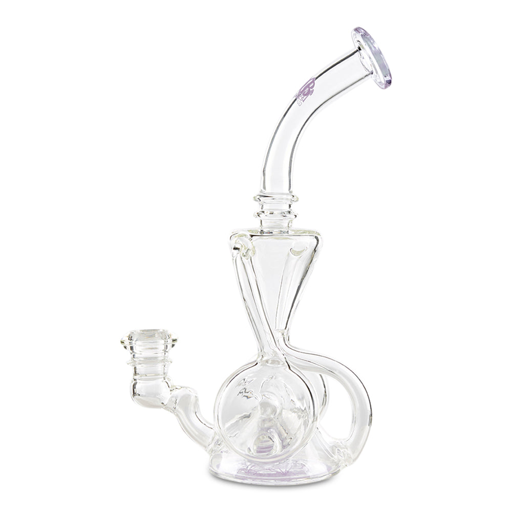 The Dual Disk Recycler from MOB Glass features a dual sprocket disc perc that helps to diffuse smoke bubbles through the water, cooling your hit. Living up to its name, this piece is also a functioning recycler water pipe, cycling water between the top and bottom chambers for maximum convective cooling. The Dual Disk Recycler is made from thick borosilicate glass and is a perfect size for both dry herb and concentrate use. This water pipe has a 14mm 90 degree joint.