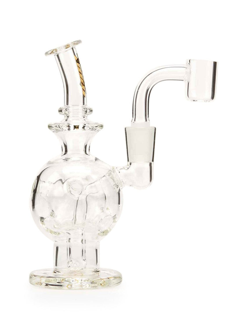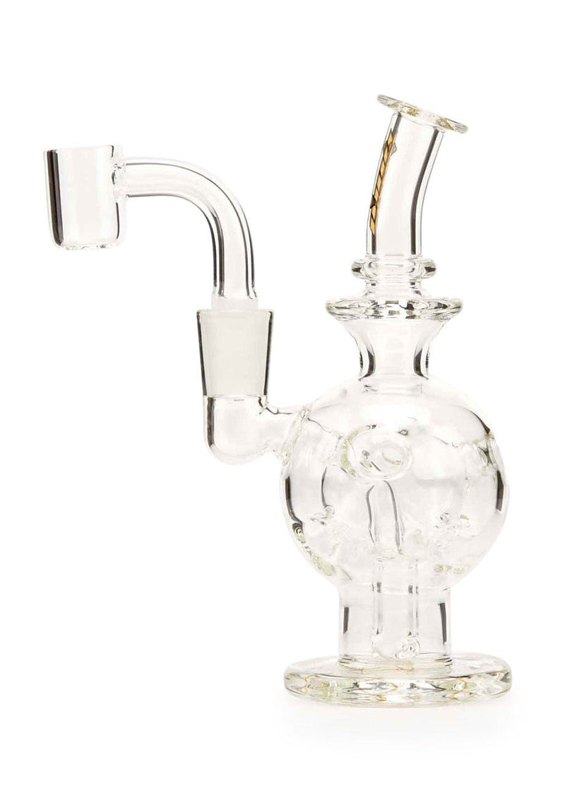 The MOB Glass Exo Mini Dab Rig is an elegant exosphere Fab egg rig that is perfect as a daily dabber. The ingenious spherical design lets you savor the real flavor of your favorite concentrate's terpenes as the smoke bubbles through the showerhead perc and gets filtered even more with the body's holes. As the water and smoke move toward the top chamber, it continuously recycles for an ultra-smooth filtered hit. The Exo chamber acts as a volume reducer, which helps keep your water level well-balanced and away from the mouthpiece. Although mini, the MOB Glass Exo is not a dainty rig -- Made from premium borosilicate glass, the rig has a thick flared foundation and is extremely comfortable in hand. The slightly bent neck makes it easy to take hits without strain. The reinforced joint is 10mm female and comes with at 10mm male quartz banger. Standing at approximately 4.5-inches tall, the MOB Glass Exo Mini Dap Rig is a fantastic combination of form and function.