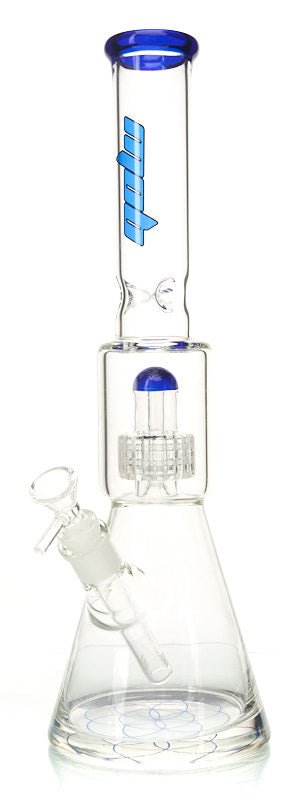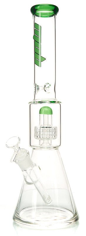 Don’t worry y’all, there’s no red pill/blue pill decision to be made here. With the MOB Matrix Beaker water pipe the only color you need to be concerned with is green (or yellow if you’re consuming concentrates). This laconic water pipe appears to be such at first glance, but once you get to know this piece you begin to notice all of its wonderful functions. First, this MOB water pipe is made from borosilicate tempered glass, which makes for sturdy protection if you’re taking this water pipe on the road. The next best thing here is the shower-head percolator present about halfway down the straight tube chamber. As well, this downstem isn’t fixed so it can be replaced any time and the six-hole diffuser at the bottom can be upgraded or downgraded to suit your needs.