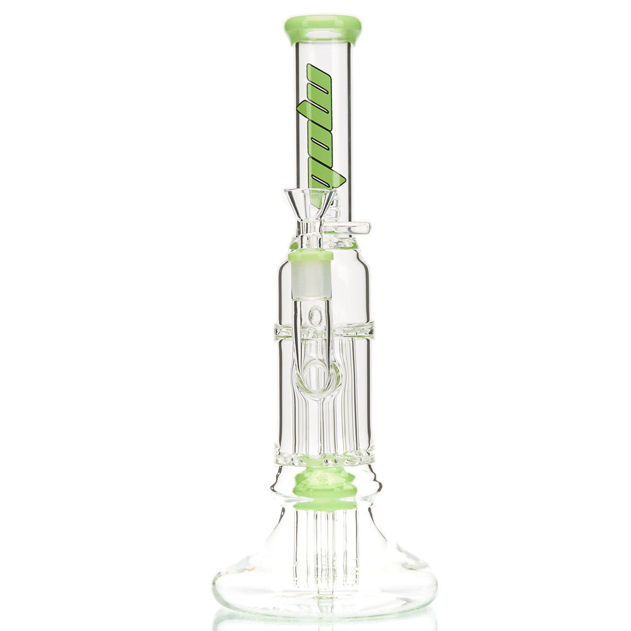 The crème de la crème of affordable water pipes, MOB Glass Obelisk, has all the bells and whistles for a monumental smoking experience. Designed with two distinct tree percs, the base has four tubes with precisely cut slits and the center 8-arm tree perc, which helps break up smoke into fine bubbles for the smoothest hits around. Standing at 11.5-inches tall, this straight tube water pipe offers impressive performance. Do forget the innovative splashguard at the top, which lets you hit as hard as you want and not have to worry about getting water in your mouth. Rounding out the beautiful design is the 90-degree female joint with colored trim at the bowl insert. The colored lip as well as the colored tree perc make this piece shine in any collection. The MOB Glass Obelisk Tree Perc Water Pipe is made from thick glass and features a 14mm female joint. The sky's the limit with the MOB Glass Obelish Tree Perc Water Pipe as it offers so many options from legal oils and concentrates to dry herbs and tobacco.