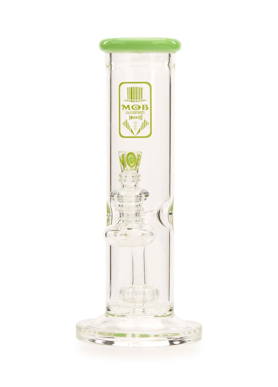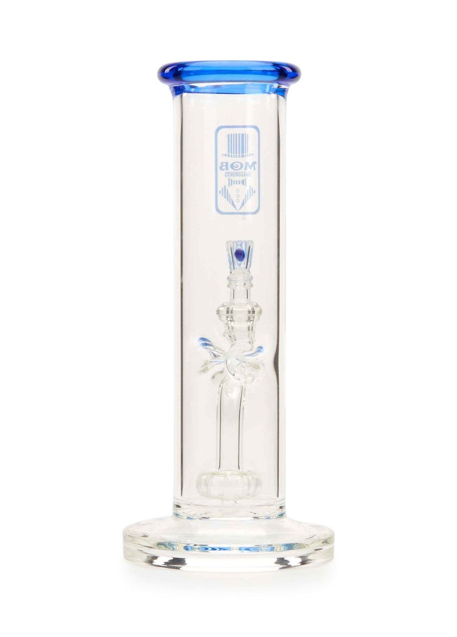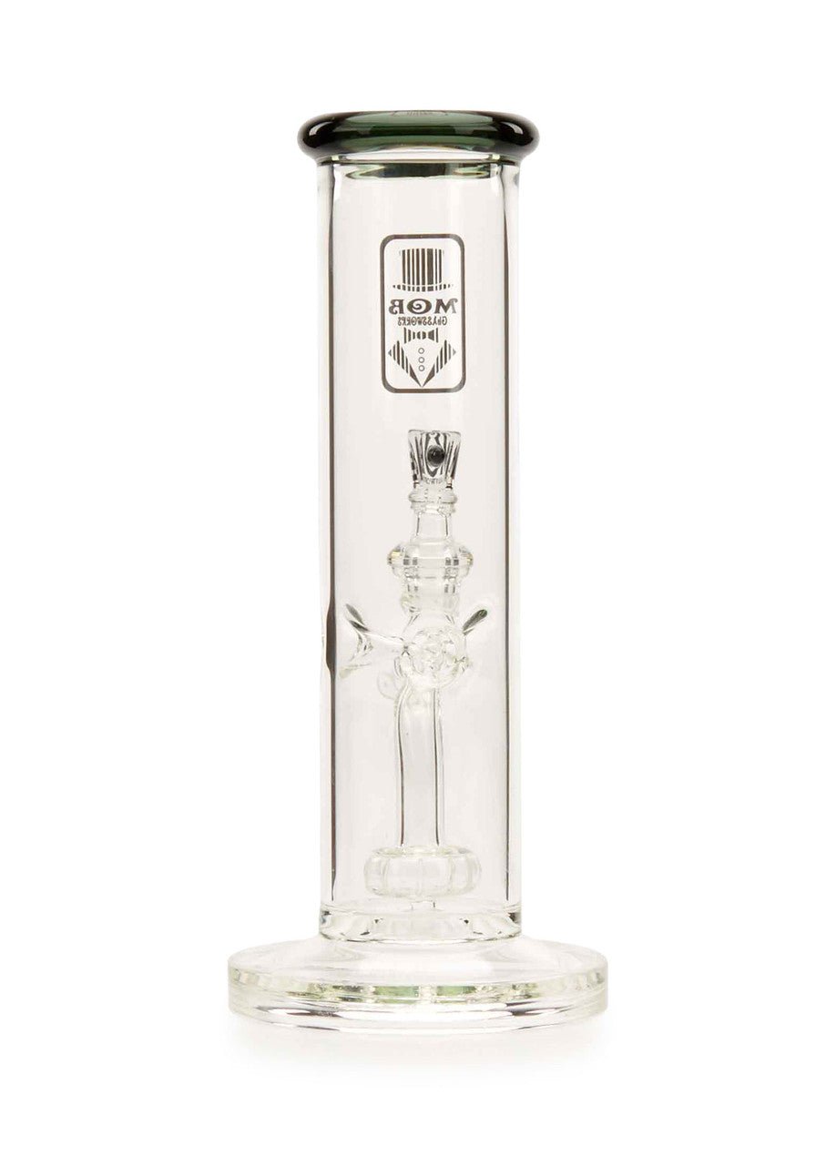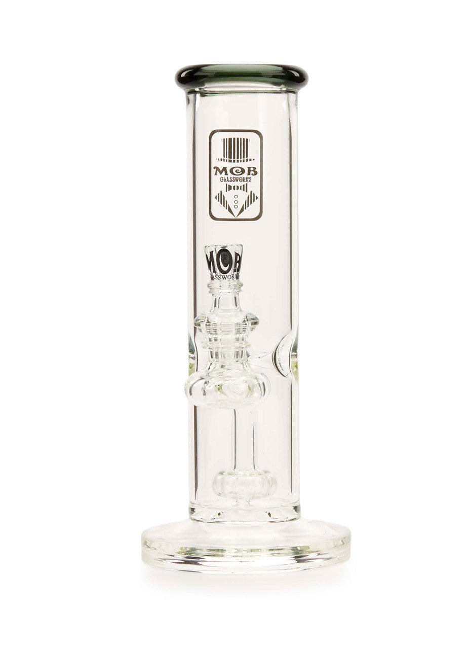 The new MOB Glass Straight Tube Hanger water pipe features a thick glass straight tube, fused stemline, ice pinch, and showerhead percolator to separate your smoke for maximum diffusion and provides super-smooth rips. The straightforward design with fixed downstem prevent wear and damage and keeps water from splashing out. The premium borosilicate glass adds extra durability, while the colored lip and MOB micro dot slide bowl creates a distinctive aesthetic. The 90-degree, 14mm joint lets you use your favorite banger and comes with a colored dot slide with MOB logo design. The MOB Glass Straight Tube Hanger is available in several eye-catching colors and is the perfect statement piece for any water pipe collection.
