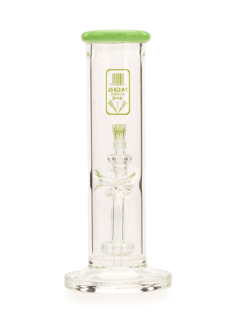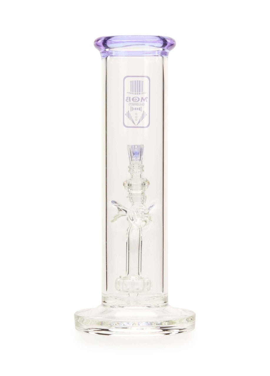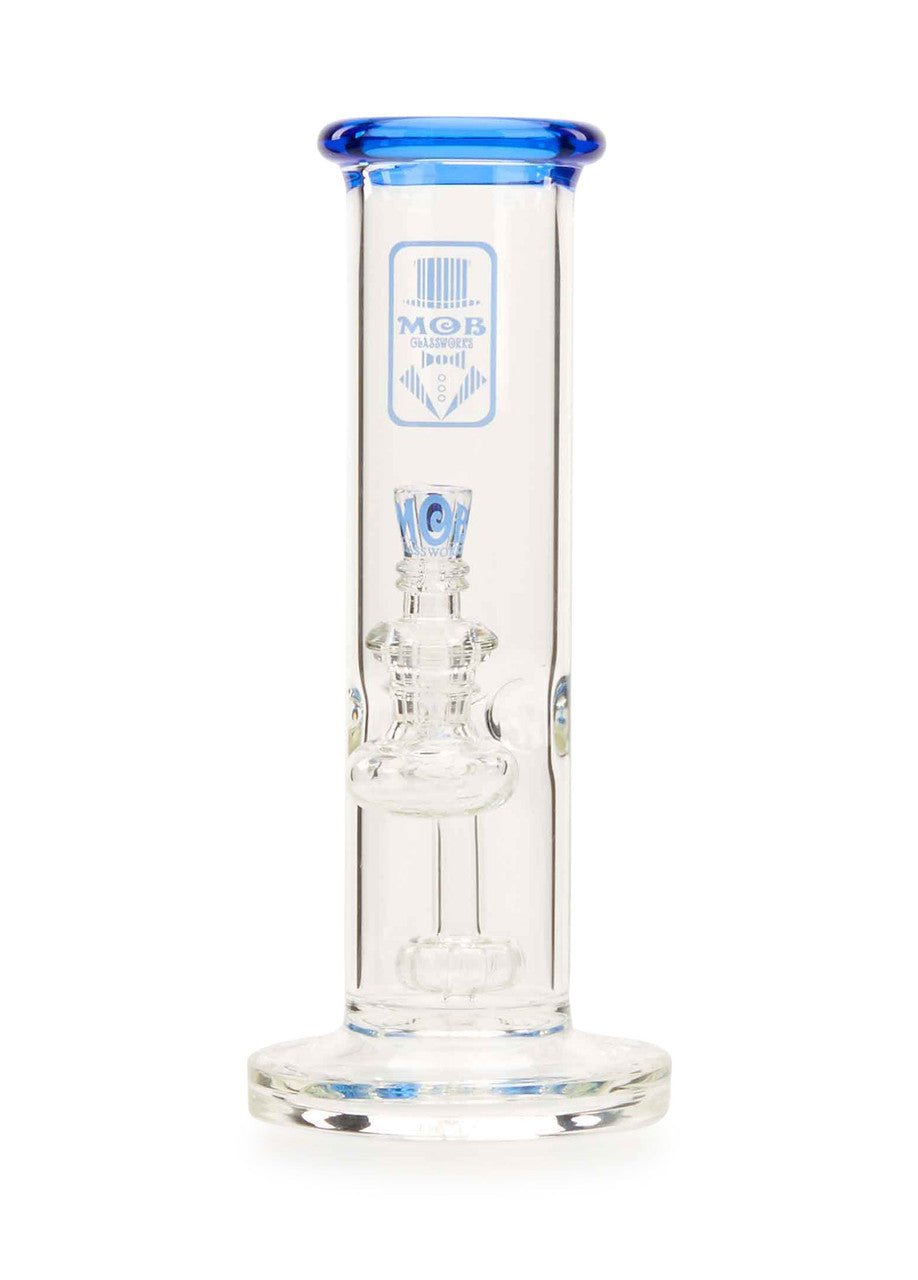 The new MOB Glass Straight Tube Hanger water pipe features a thick glass straight tube, fused stemline, ice pinch, and showerhead percolator to separate your smoke for maximum diffusion and provides super-smooth rips. The straightforward design with fixed downstem prevent wear and damage and keeps water from splashing out. The premium borosilicate glass adds extra durability, while the colored lip and MOB micro dot slide bowl creates a distinctive aesthetic. The 90-degree, 14mm joint lets you use your favorite banger and comes with a colored dot slide with MOB logo design. The MOB Glass Straight Tube Hanger is available in several eye-catching colors and is the perfect statement piece for any water pipe collection.