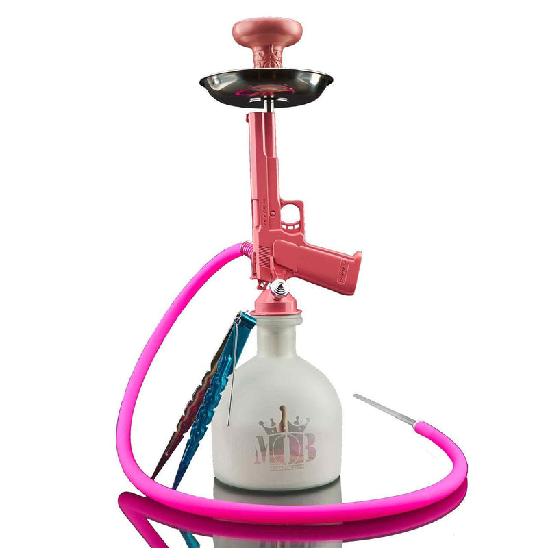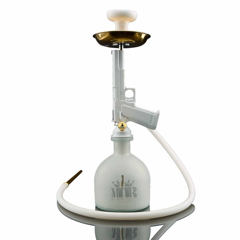All hookah enthusiasts will rage over the MOB Hookah Pistol! The MOB Hookah Pistol is a sharp competitor against other pistol hookahs with its generous metal stem. The MOB Hookah Pistol is a mini-marvel that impresses with its unparalleled design and durability. This Pistol Hookah is a mighty workhorse that comes complete with a metal shaft & downstem, a stunning, extra-thick contoured glass vase, and a matching hose and ceramic bowl. The widest portion of the base is 6-inches, which allows for additional stability on tabletops and holds up to 7 ounces of water. The MOB Hookah Pistol, equipped with a purge valve, lets you enjoy the ultimate smoking experience. Get ready to be locked and loaded with this complete hookah set up!