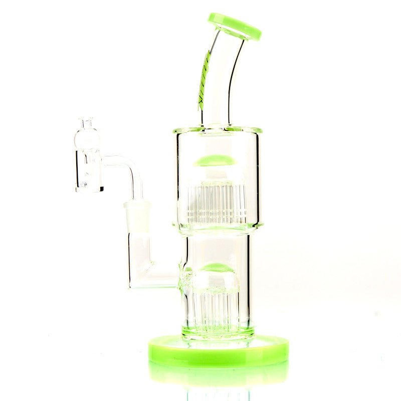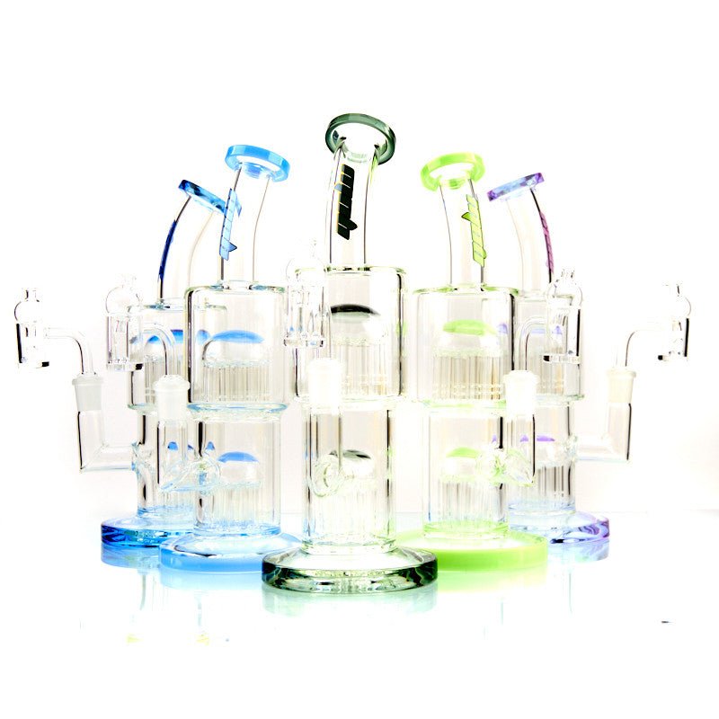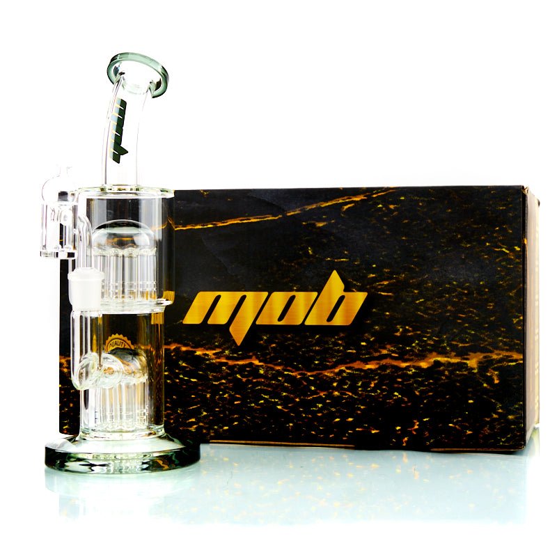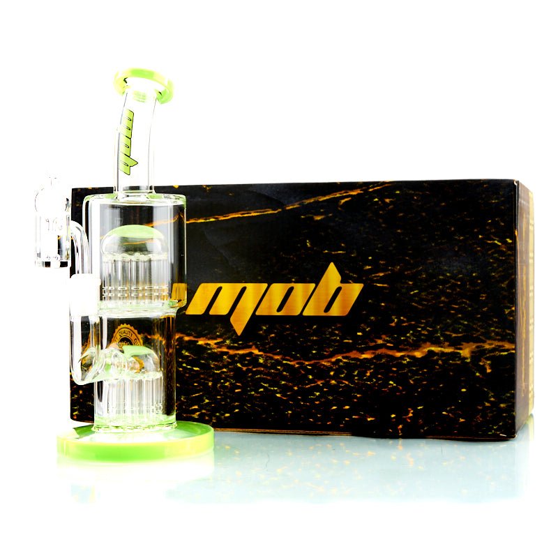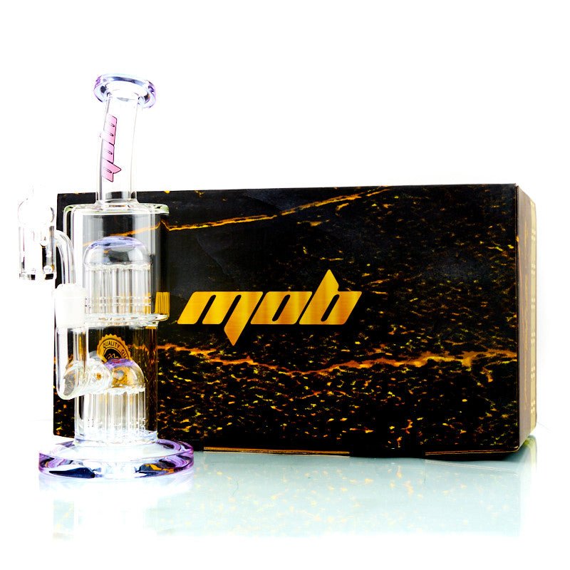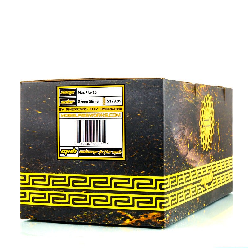 The Mac 7 to 13 Dab Rig by Mob Glass Works is a dab rig that features a seven slit in line percolator and vibrant colors. This is a classic commentary on the 7 to 13 style of dab rigs, though they can still be used for flower. The Mac 7 to 13 style Dab Rig is an excellent piece that allows a user to pay the price for high end glass, but have the experience of a heady water pipe itself. This water pipe is a solid experience for amateur smokers and professionals alike.