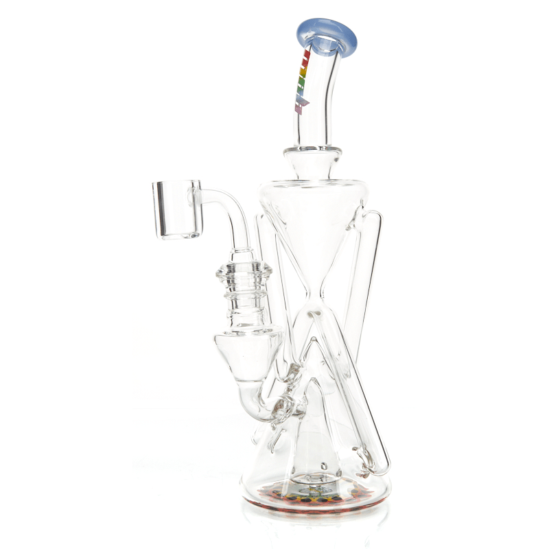 The MOB Glass X-Cycler Dab Rig is an incredibly high quality piece of glass that features criss-crossing recyclers that form the shape of an X. This dab rig is created from borosilicate glass and utilizes a slime colored flared lip. The bottom of the base on this piece also showcases a pyramid shaped design and a flower of life graphic on the bottom basin. This dab rig also has a four hole diffuser on an interior collins percolator, on top of the recycling features already present. A well balanced dab rig, MOB Glass has done it again by providing a high quality, full functional piece at a very reasonable price for high end glass.