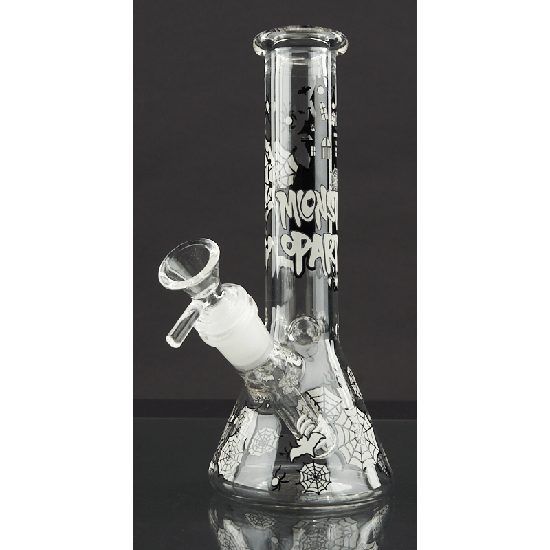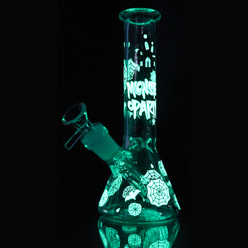 The Monster Glow Beaker Small Water Pipe is an elegant and efficient beaker bottom pipe that features Monster designs and glow in the dark features so full always be able to see your water pipe, even in the dark! The beaker bottom style water pipe allows smoke to gather in the base and pack a powerful punch that’s sure to take you to Cloud 9 every single time. This straight tube beaker bottom is a percolator-less variety of the straight tube and offers a no nonsense option to the world of beakers and straight tube pipes. This water pipe is for those that prefer not to have to clean their pipe much and without percolators that makes this water pipe the perfect option to avoid a mess.