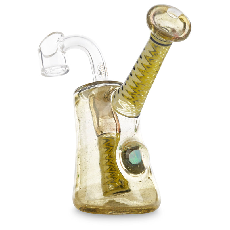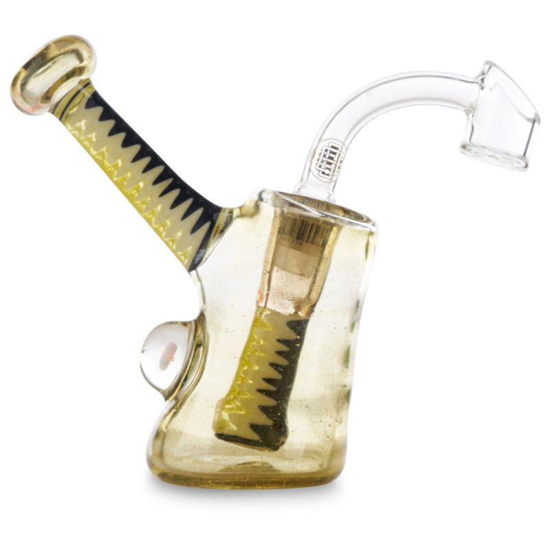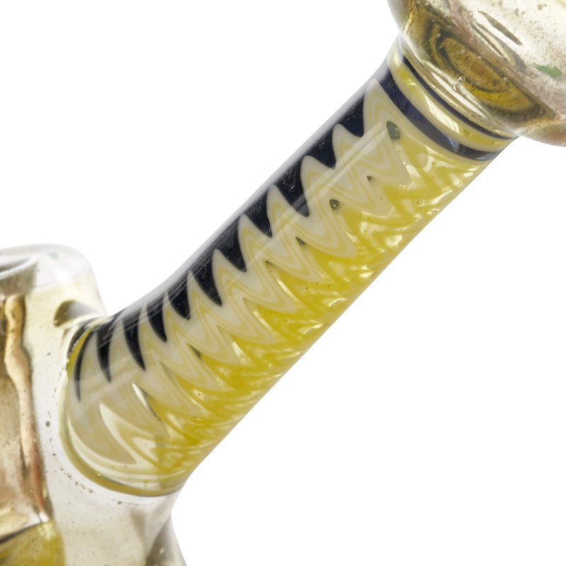 Natey Biskind aka Natey Glass is a glass artist based out of Asheville, North Carolina. For his amazing glass art, Natey has earned many awards and taught courses all over the globe. The zipper bubbler is a phenomenal design by Natey Glass. This piece will bring out the pure, delicious flavors of your product without the need for a large volume of water. This bubbler is fully worked with yellow glass and a yellow and black wig wag design on the downstem and mouthpiece. This bubbler stands at approx. 3.5" tall and has a 10mm female joint.