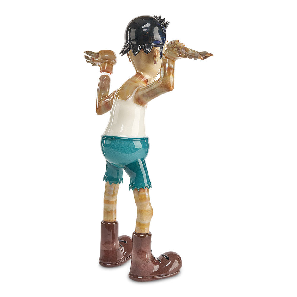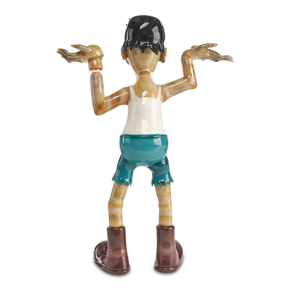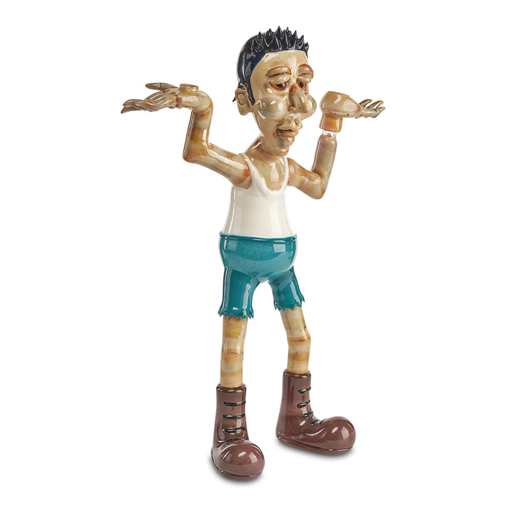 The Dude is a 2016 Niko Cray piece, depicting a man shrugging nonchalantly. From his bootlaces to his tank top to the texture of his skin, Niko went above and beyond on this piece. The joint is integrated into his arm, where the hand-shaped dome conceals said joint. The mouthpiece is located in the opposite hand.