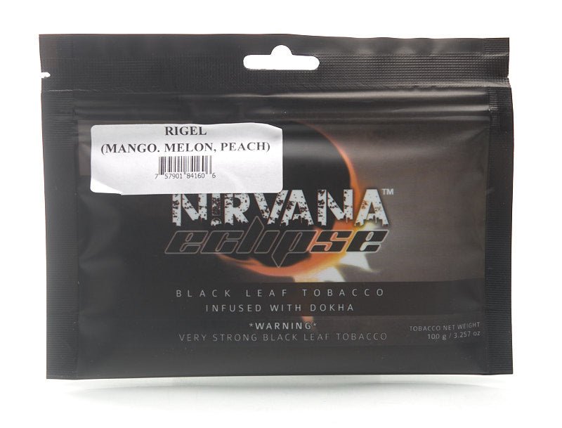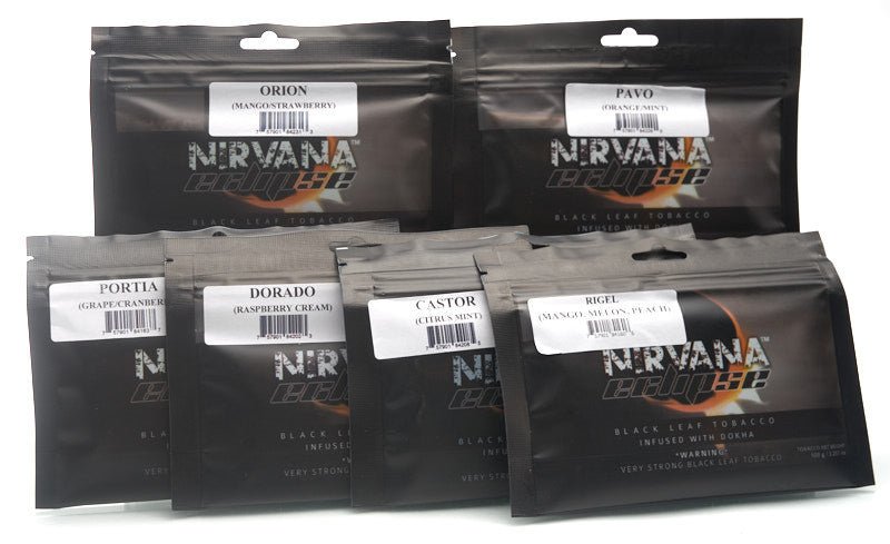 If you're looking for shisha tobacco that will take your hookah seshes to new heights, you've come to the right place! The Nirvana Eclipse Shisha 100g is bound to become your new go-to shisha tobacco. The Nirvana Eclipse Shisha 100g is made from dark leaves, meaning that it is packed full of nicotine! If you're a beginner in the world of hookah, you may have to take it a bit easy with this shisha. The nicotine is no joke! The Nirvana Eclipse Shisha 100g is infused with Dokha tobacco, which alone can give you quite the rush. Mixing the Dokah along with the high nicotine content provided by the dark leaf base used in this line is sure to send tingles down your spine. To make your hookah smoking experience all the best, the Nirvana Eclipse Shisha 100g features 9 scrumptious flavors for you to choose from to have the perfect smoke sesh in your forecast!