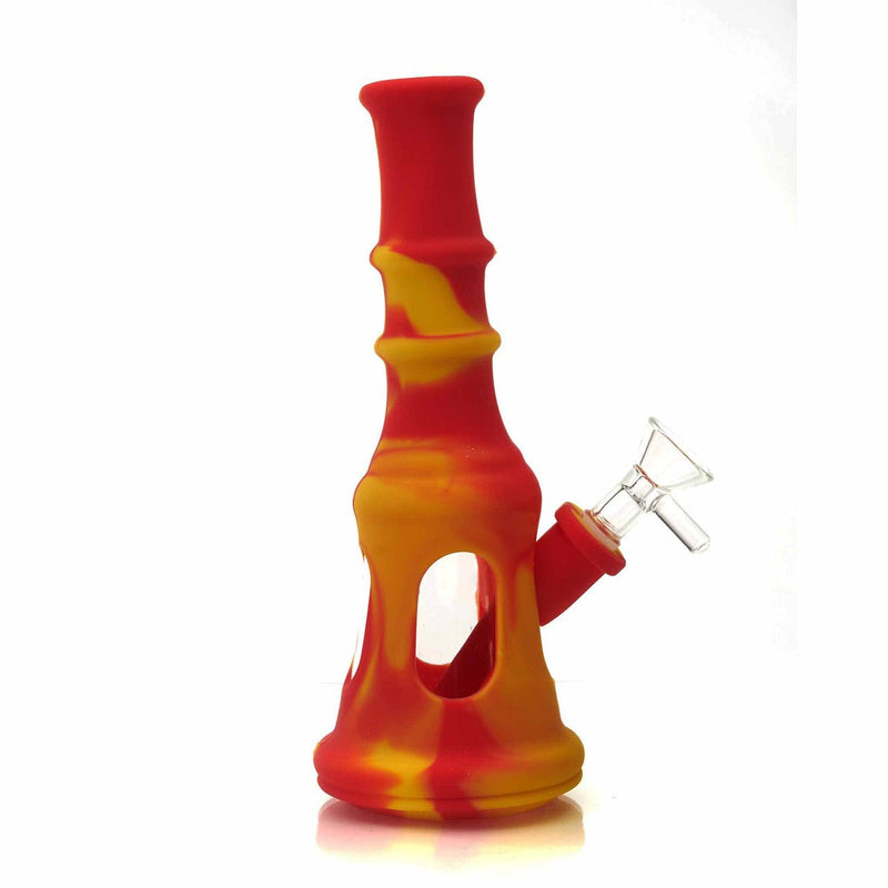 The Paradise Silicone Bowman is your new go-to water pipe for on-the-go seshes! The Paradise Silicone Bowman is a compact beaker water pipe made from food grade, toxin-free silicone. The Bowman is a luxe silicone water pipe that is extremely durable and 100% washable! With this beaker base water pipe by your side, you can conveniently and discreetly bring this piece with you on the road with its ability to be taken apart. The Bowman is best for those looking to have a durable water pipe on deck and won’t make you sacrifice losing out on glass with its glass chamber located in its body! The Bowman is equipped with a 45-degree female joint piece paired with a fixed 4-hole diffy perc downstem. All you need is your favorite 14mm male slide, and you’re ready to get the party started! With its 4-hole diffy percolator and ice pinch features, the Bowman is locked and loaded to give you some insanely smooth hits. You can find the Paradise Silicone Bowman outfitted with sick designs in your choice of 3 colors! With this silicone mini beaker by your side, you’ll be set for great times and fun seshes.