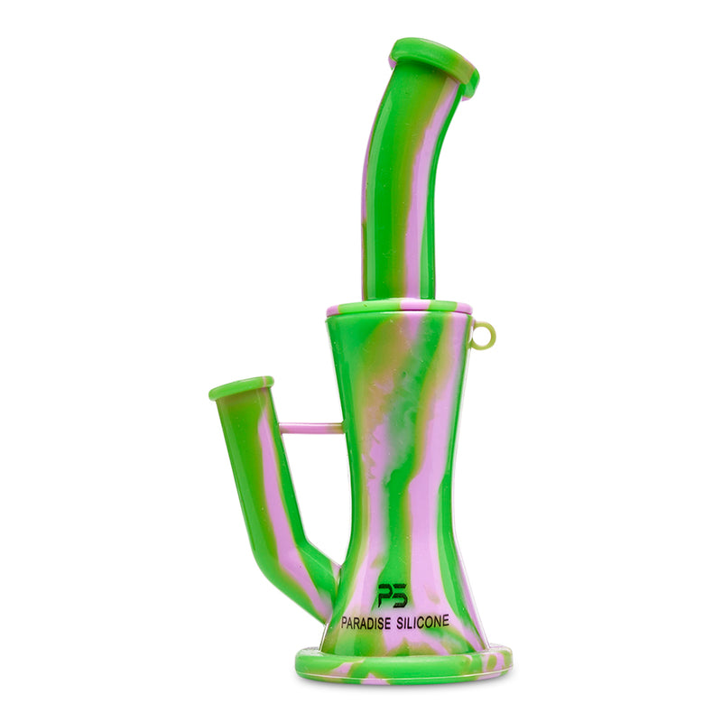What you see is not always what you get. With the Paradise Silicone Hourglass Water Pipe, you get much more. Not only is this water pipe unbreakable with the food grade silicone structure, the Hourglass Water Pipe comes packed with awesome features. Inside the piece is a honey comb perk which ultimately gives you a smoother hit by diffusing the smoke and cooling it as it makes contact with the water. Additionally, the bottom of the piece contains a concentrate slick that you can store your favorite solid oils inside making this piece perfect to travel with. With fantastic features, great function, and a beautiful multicolored design, the Paradise Silicone Hourglass Water Pipe is a must-have for every collection.