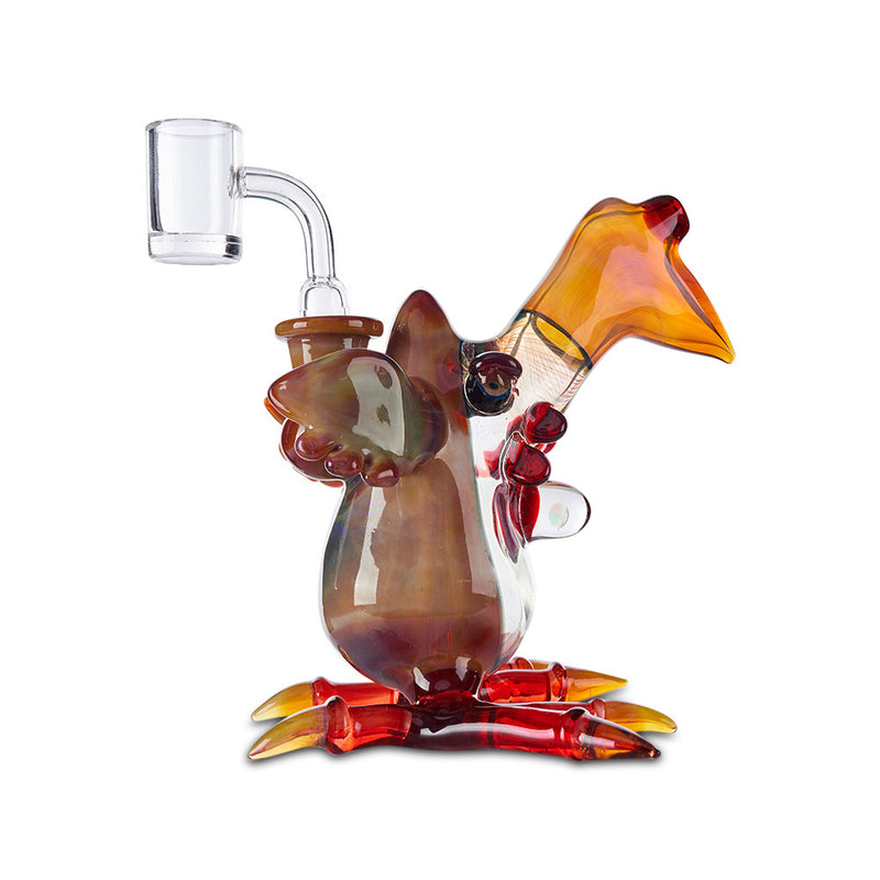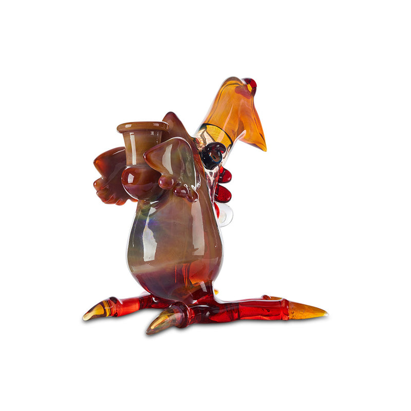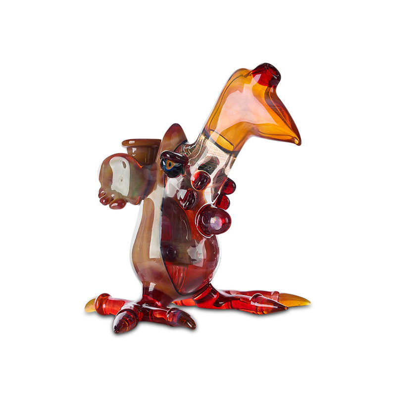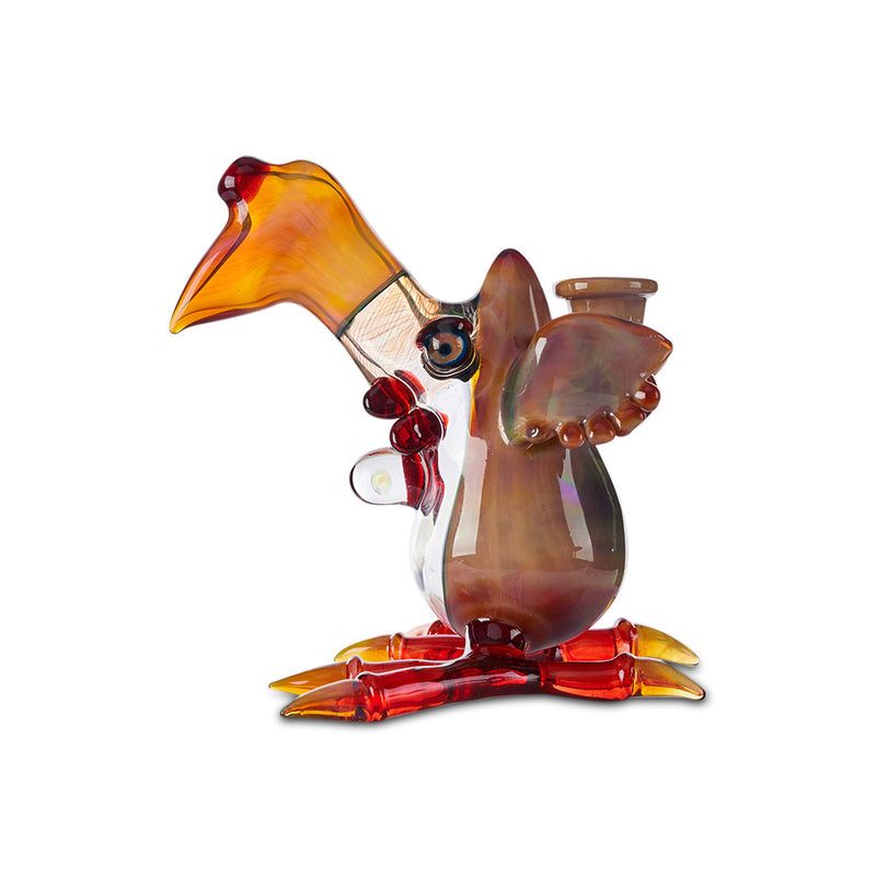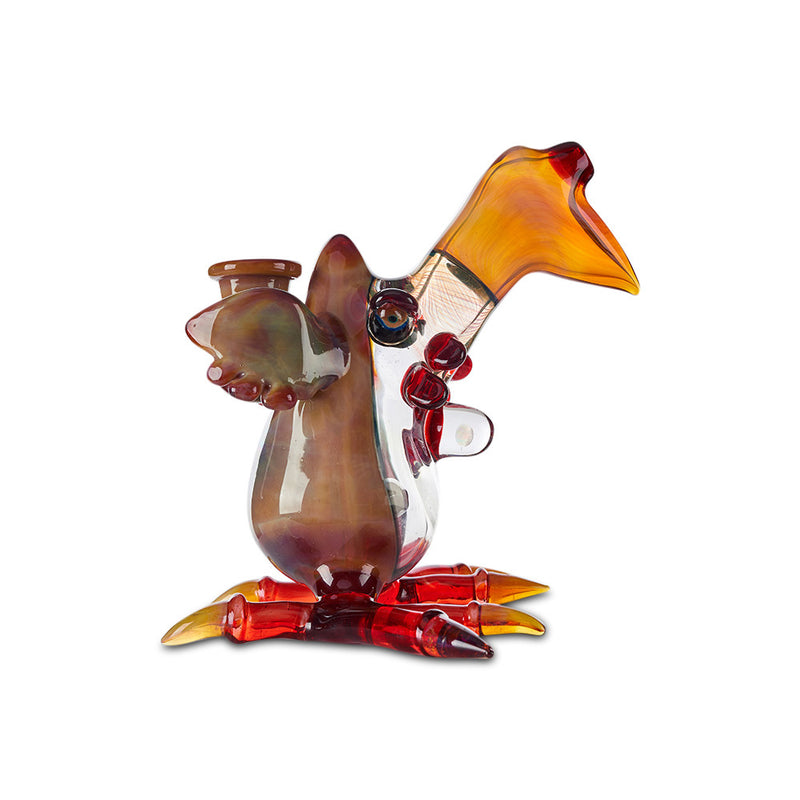 This bird has tons of great fume details in the beak, stomach, and feet. This bird has a wide 4-hole diffuser with a worked 14mm female joint nestled between the two wings. The sculpted feet are extremely wide, solid, and stable for any table surface, with impeccable detail in the toes and talons. The mouthpiece is located at the top of the beak, and the detailed eyes really set off the bird.