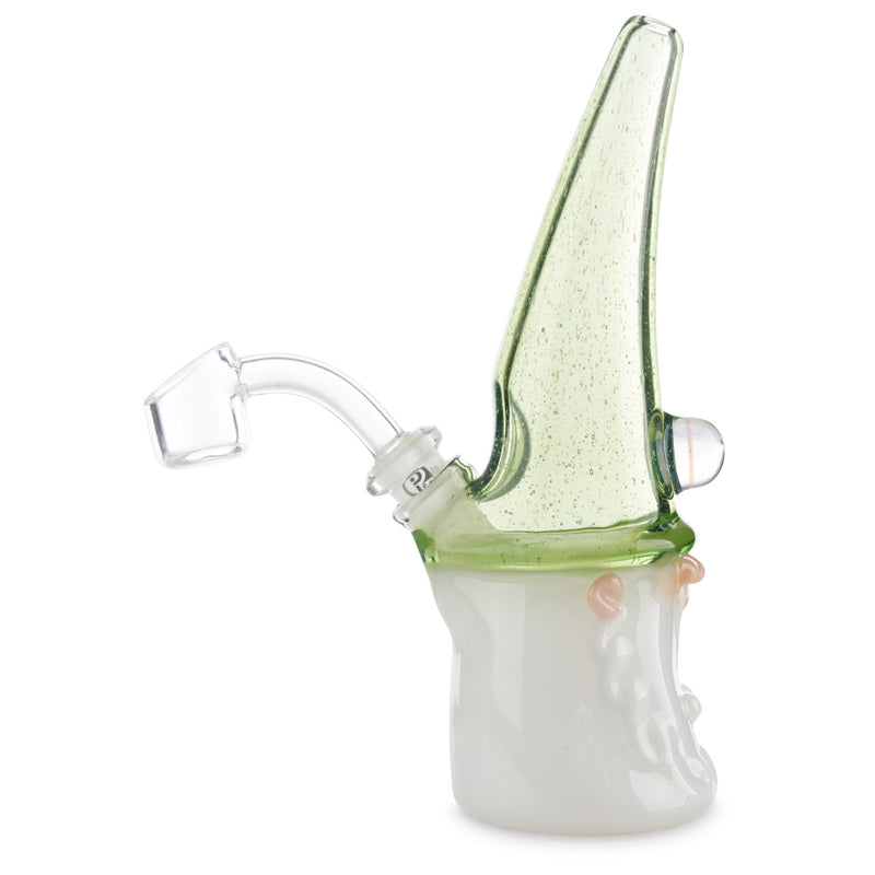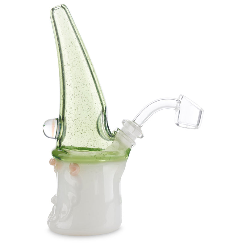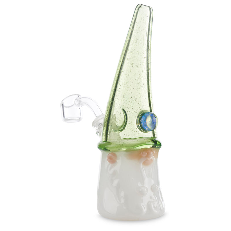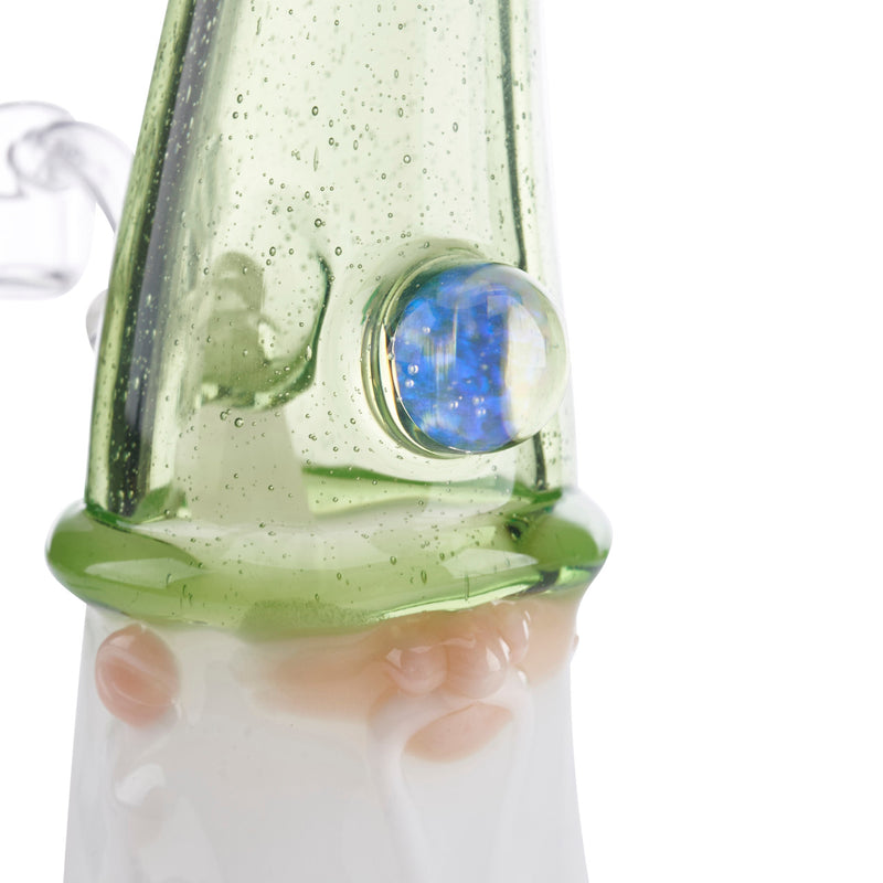 Phil Siegal is a master of his craft with amazing attention to detail in each of his immaculate glass pieces. This jammer has incredible detail in the sculpting of the face, perfect proportions, immaculate attention to detail, and truly flawless construction. This particular Warlock has a Dabsinthe cap with an Antidote brim. Dabsinthe is an astoundingly green color with tons of beautiful bubbles within the stable green color. The cap is accented with an incredible 10mm opal coin that sparkles and shines with the light. This jammer measures 6.5" from toe to tip, and has a removable 2-hole downstem with a 10mm (45 degree) joint.