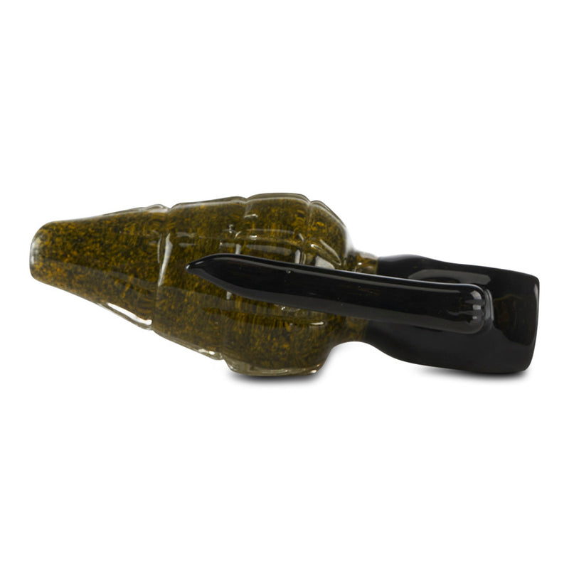 Drop a grenade on your glass game, literally, with the Pioneer Grenade Novelty Hand Pipe. This grenade themed glass pipe features dark green glass on the bowl and a black handle. You won't be dropping this bomb with the black glass pin on the side that adds extra grip and support when holding. Besides the beautiful design, this hand pipe has a steam roller structure providing you a smooth, straight shot from the bowl to the mouth piece. Blast off your dry herb with the Pioneer Grenade Novelty Hand Pipe.