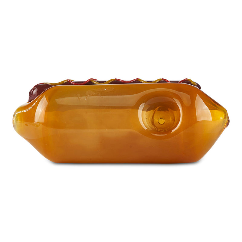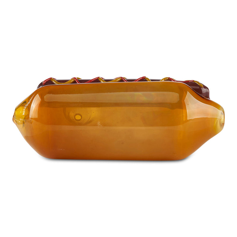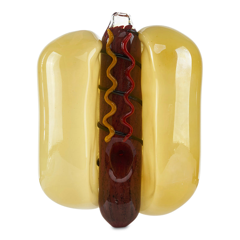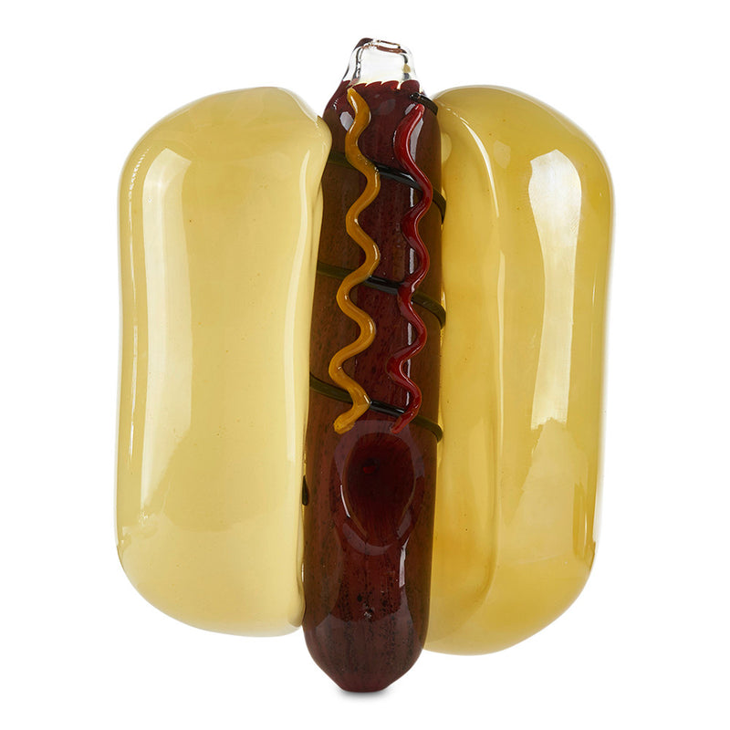 Hot Dogs just got even better. Made with Borosilicate Glass, the Pioneer Novelty Hand Pipe features an awesome hot dog design that includes the bun and even the condiments on top. The smaller hot dog hand pipe is a steam roller design that has the bowl located on the side of the bun and the carb on the tip of the wiener. The larger style hand pipe is a little bit different featuring the bowl on the hot dog itself while still maintaining the steam-roller design. With the Pioneer Novelty Hand Pipe you can make every party a sausage party.
