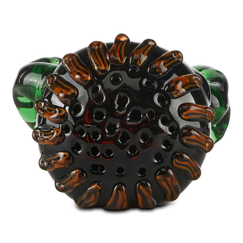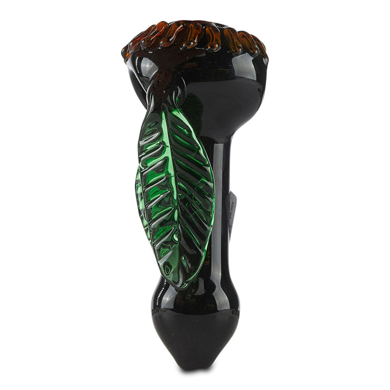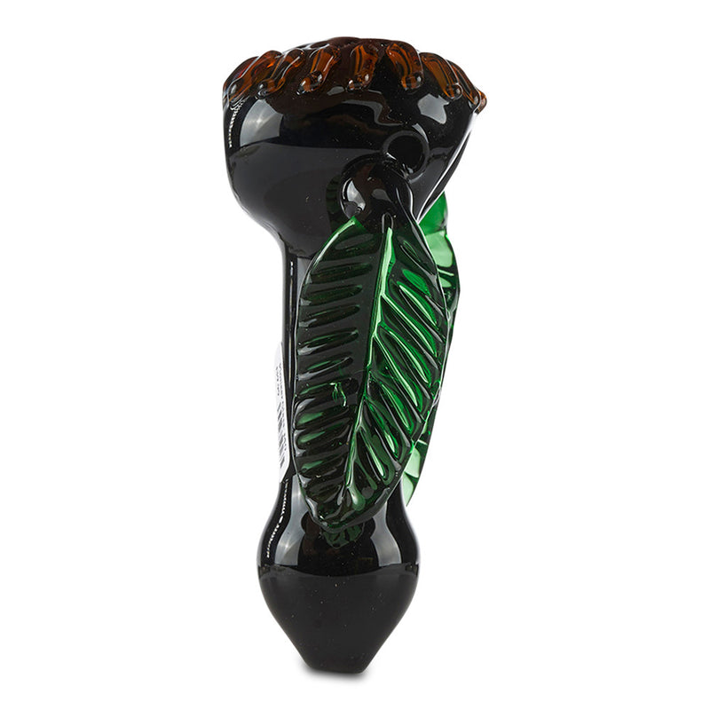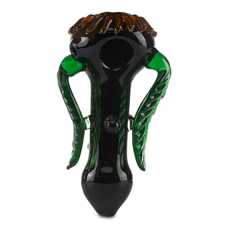 You won't be-leaf this deal! The Pioneer Leaf Novelty Hand Pipe is a highly unique borosilicate glass piece featuring a sleek black body and two big green leaves that stem out from the sides of the bowl and extend all the way to the mouth piece. The leaves provide and extra handle and support for your hands keeping the bowl secure and sturdy while you use it. Additionally, the bowl features a textured flower on the front giving this piece an all around beautiful design.