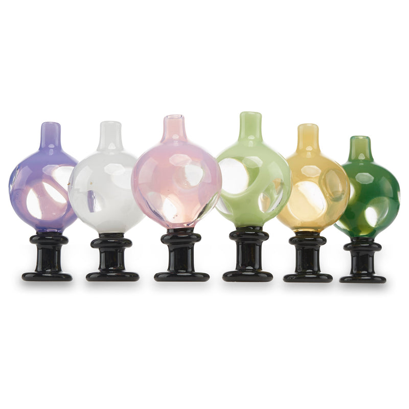 Never waste any of your concentrates again with these colorful Rig Honey Bubble Carb Caps. Each Bubble Cap is equipped with a black handle at the top ensuring your hand's safety from the hot banger or nail. The handle also comes with hole in the top allowing you to restrict or increase airflow. Made from Borosilicate glass, the Rig Honey Bubble Carb Caps are a must have for any quartz banger. Just place the cap on the top of your banger or corner of your nail and enjoy a personalized dab experience you do not want to miss.