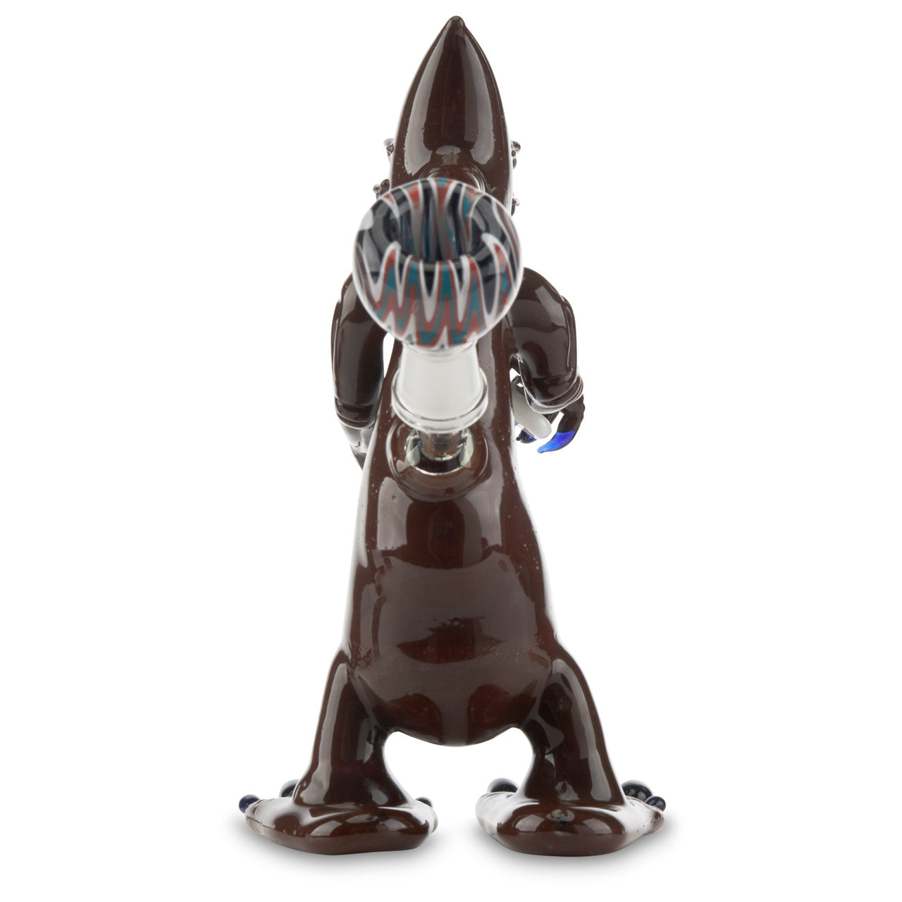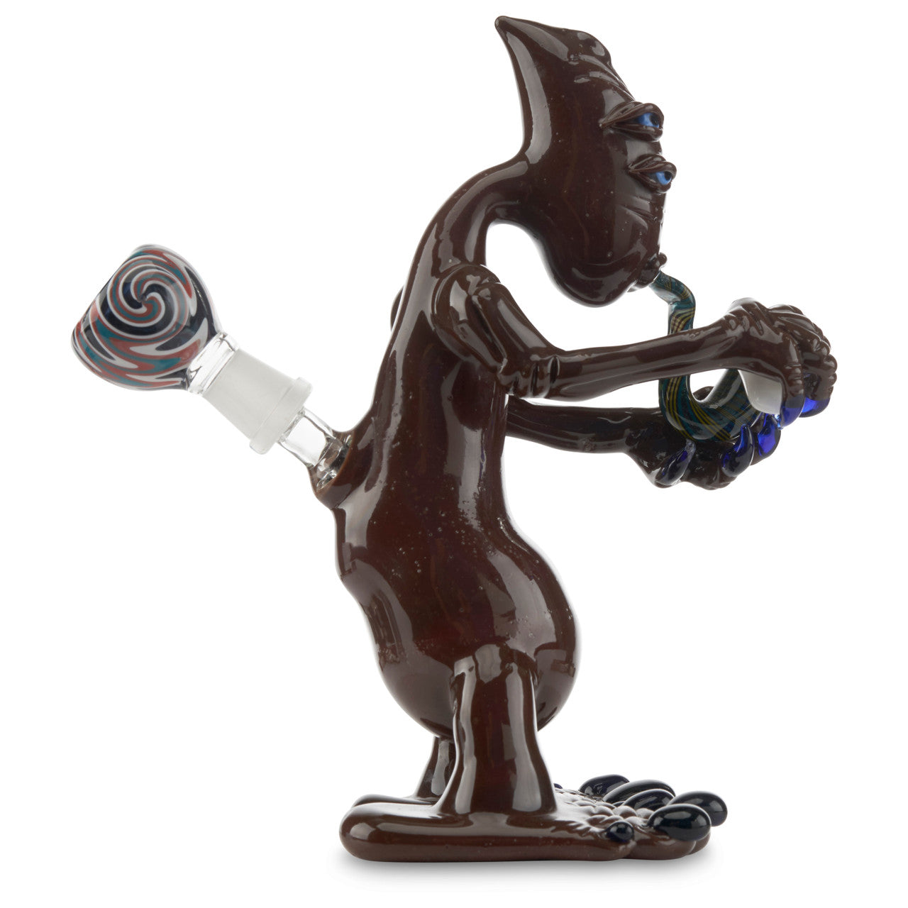 Sandalz Glass was founded by Jayme Hunter, a glass artist based out of Florida. This Sandalz Lit Alien Pipe is truly unique. This alien is designed with brown glass for the body while his four eyes and claws are cobalt. The alien is holding a worked sherlock pipe designed with green, blue, and yellow linework. This piece stands at approx. 8.5" tall and is made with a 14mm male joint. Get this awesome Sandalz Lit Alien Pipe today!