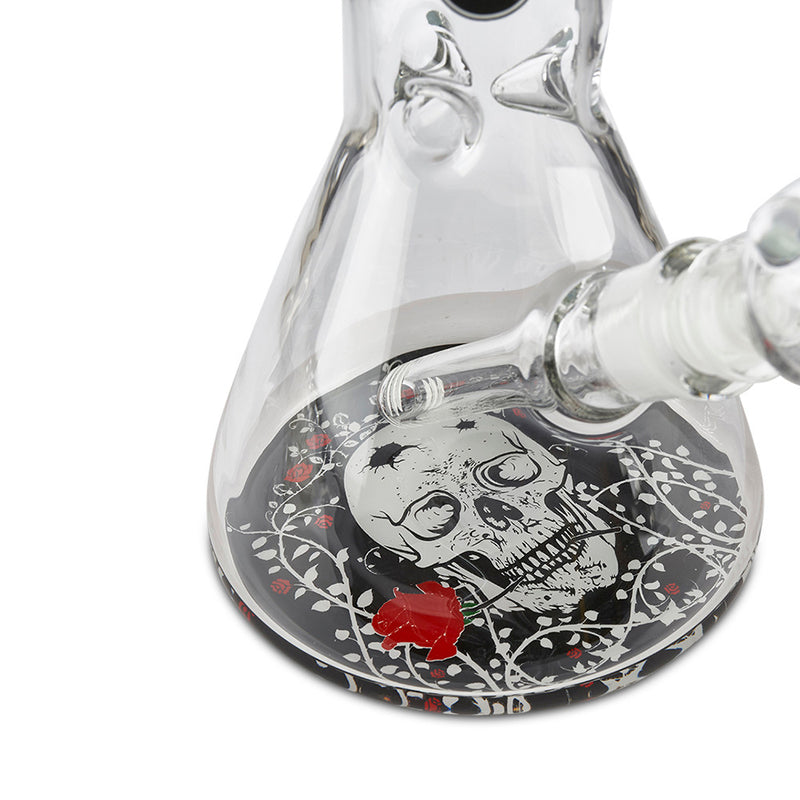 Add some edge in your smoke collection with the Skull & Roses Water Pipe. This clean water pipe is a beaker style borosilicate glass water pipe with an integrated ice catcher. The bottom of the water pipe has a beautiful skull and roses design that you can see as you look down into the pipe itself. With a height of 12", this water pipe is compact and easy to store. Each Skull & Roses Water Pipe includes a standard horizontal downstem with a 14mm dry-herb bowl providing you with a complete set-up to have you ready to go!