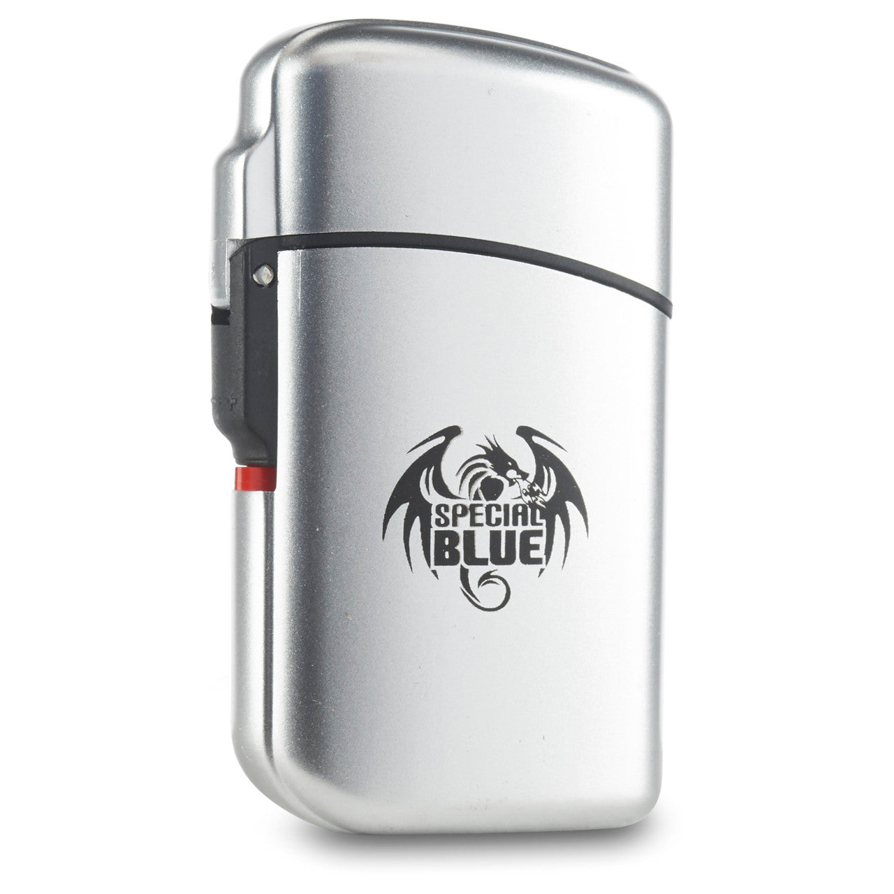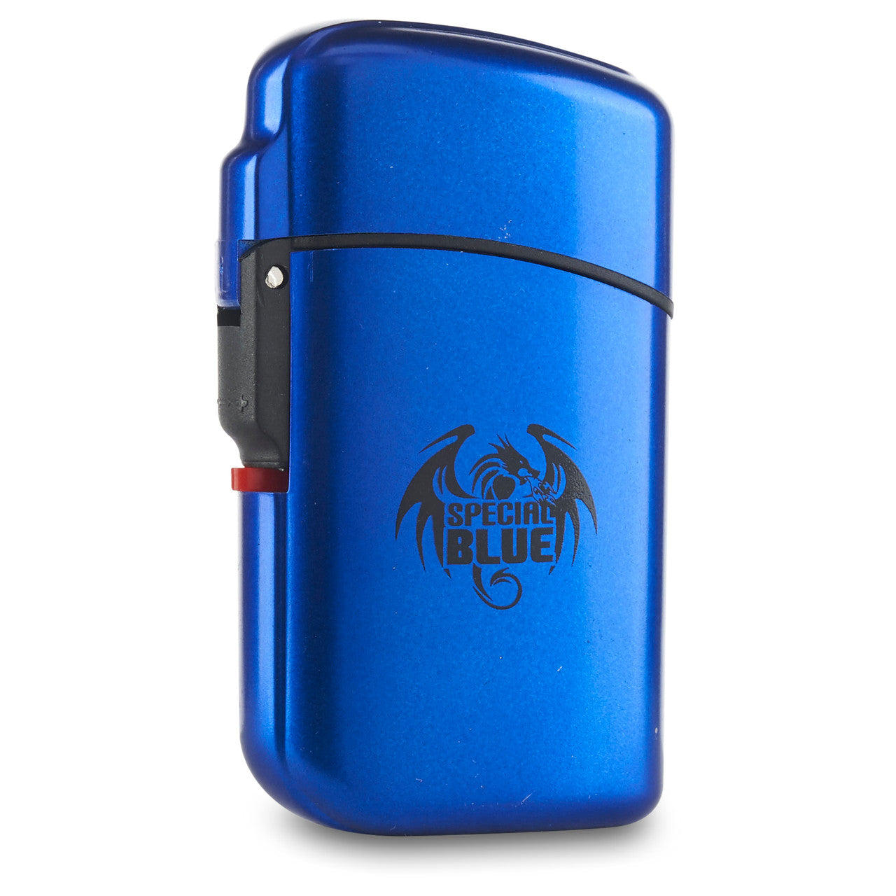 The Special Blue Classic Metal Lighter, handheld single-flame butane torches in assorted metallic colors. The lighters have a plastic case with a metallic paint finish. Offered in a mini size, these torches are travel friendly and easy to store. To use the lighter just flip the top open and push the ignition button. Features a flame adjustment switch and a refill valve on the bottom.