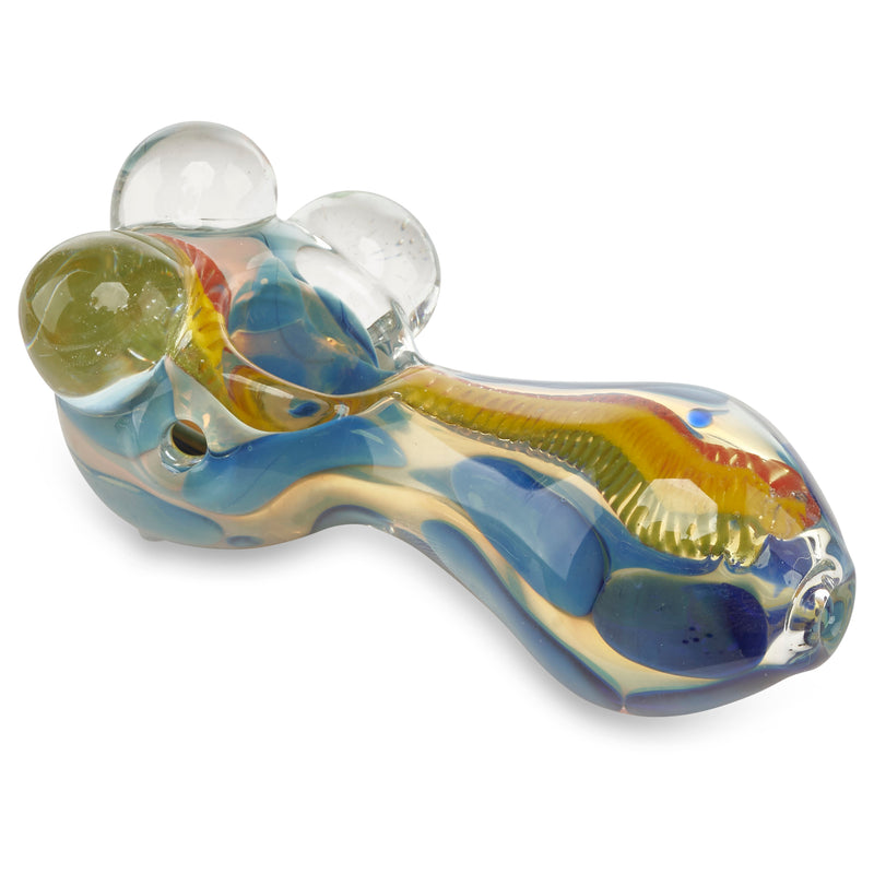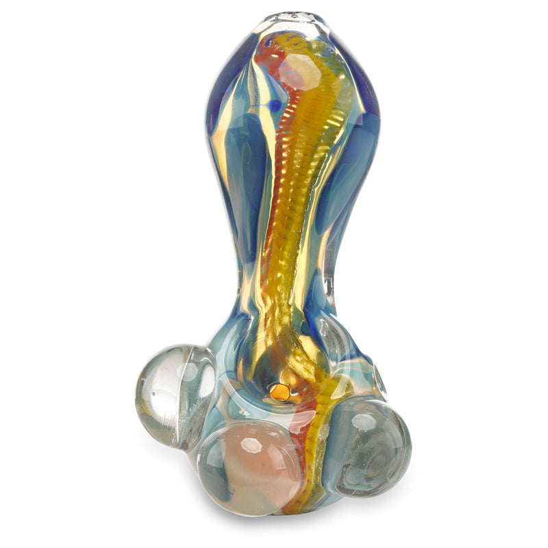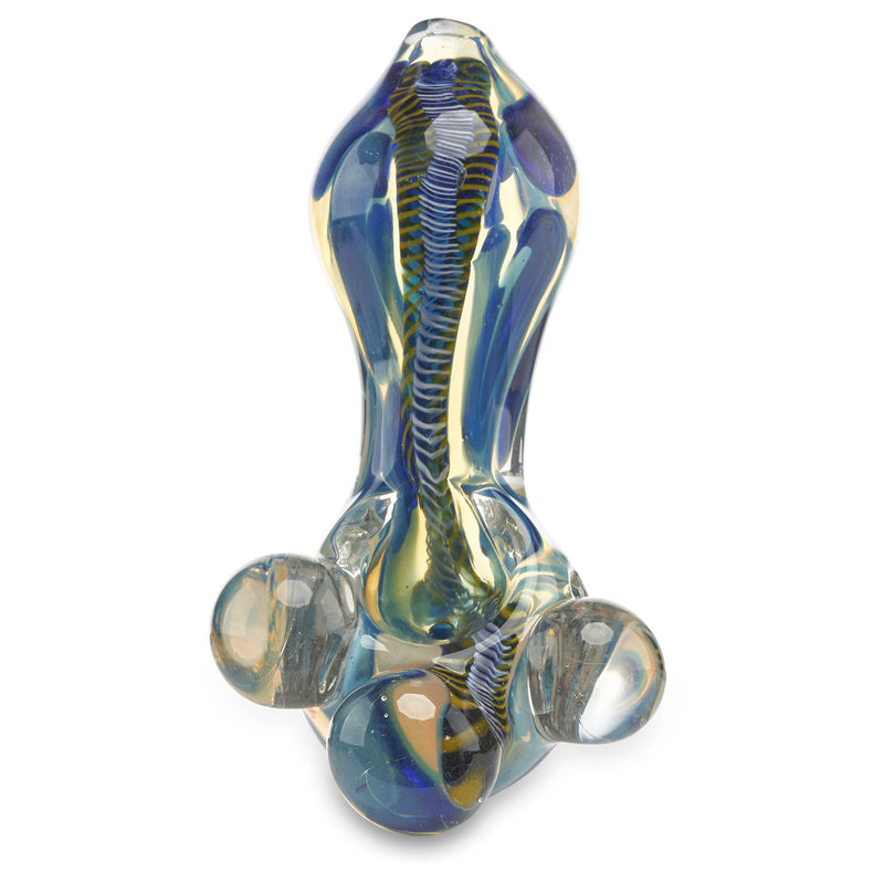 Aesthetics and practicality combine to create the Three Marble Hand Pipe. Made from borosilicate glass, this spoon pipe features a unique marbled color pattern with two thin linework tubes running from the bowl to the mouth piece. Additionally, the hand pipe includes three large glass marbles on the the bowl that provides you with extra grip for a more comfortable hold. The Three Marbled Hand Pipe is available in multiple colors.