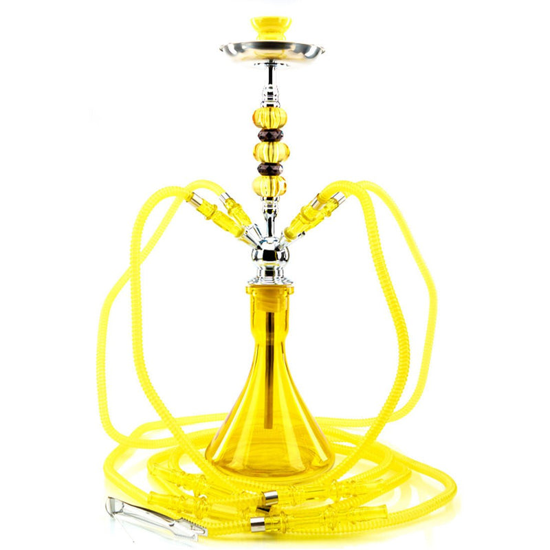 Create a simple and elegant get together with the Vadra Ness Hookah. Like a modern skyscraper, the Vadra Ness is a complete work of art. This four-hose Hookah features an artist stem with yellow and black acrylic jewels that complement the stunning amber base. The vase grommet securely connects the stem to the glass vase. With a four-hose hookah, you smoke sessions just became more social. Measuring at 24-inches tall, this Hookah is an overachiever when it comes to performance and function. The base is a whopping 10-inches in diameter, which offers you optimal balance and sturdiness, especially when used by multiple people. To use, add water, insert the aluminum stem, attach the free matching ceramic bowl along with your favorite coals and shisha! The Cadra Ness Hookah is an ultra-modern piece that is sure to impress and Hookah enthusiast!